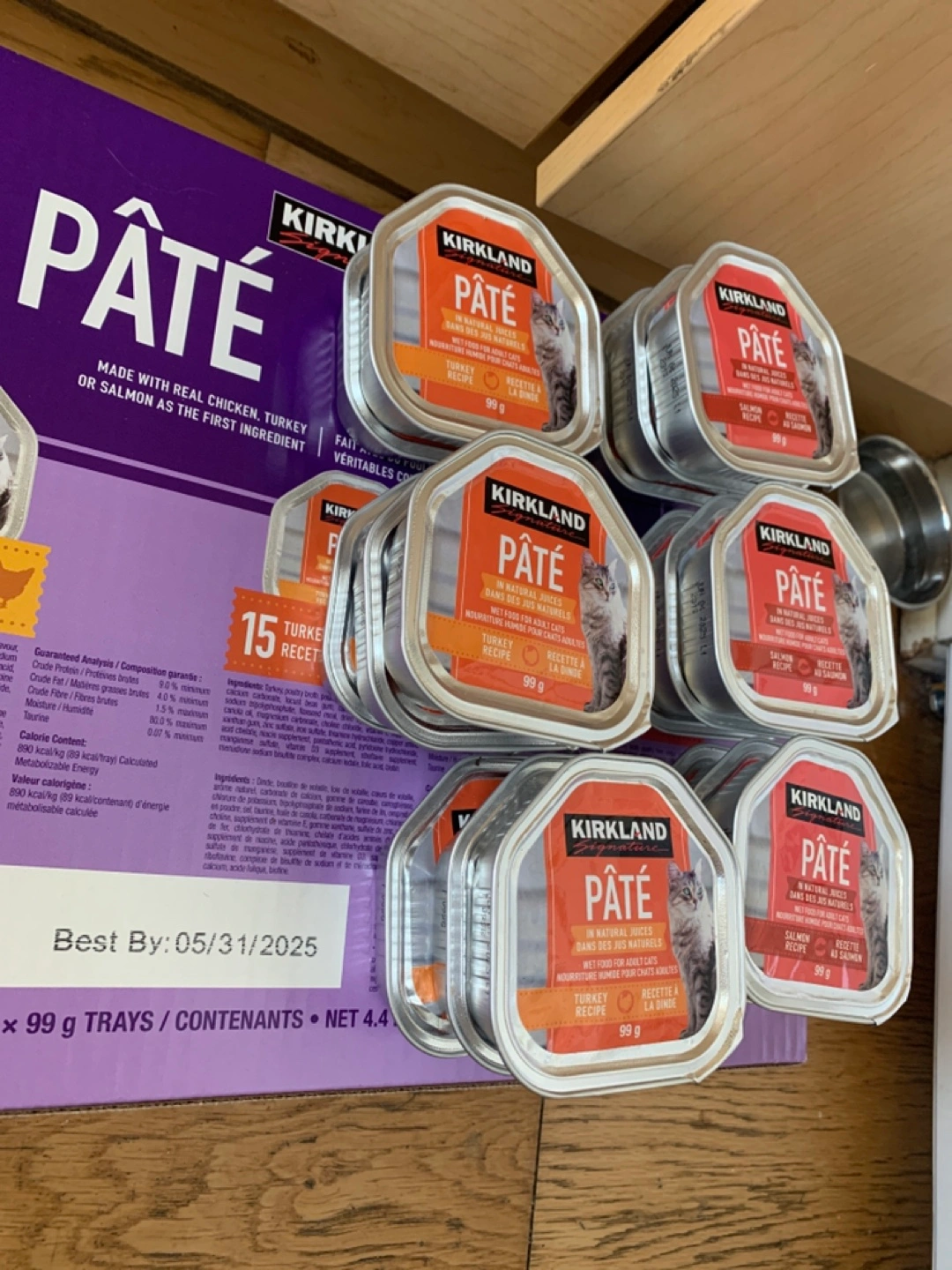 Package of 17 Kirkland Signature Pâté wet cat food. Turkey and salmon recipes available. 99g trays. Best before 05/31/2025.
