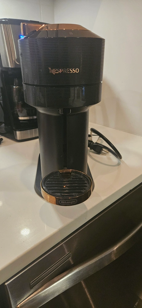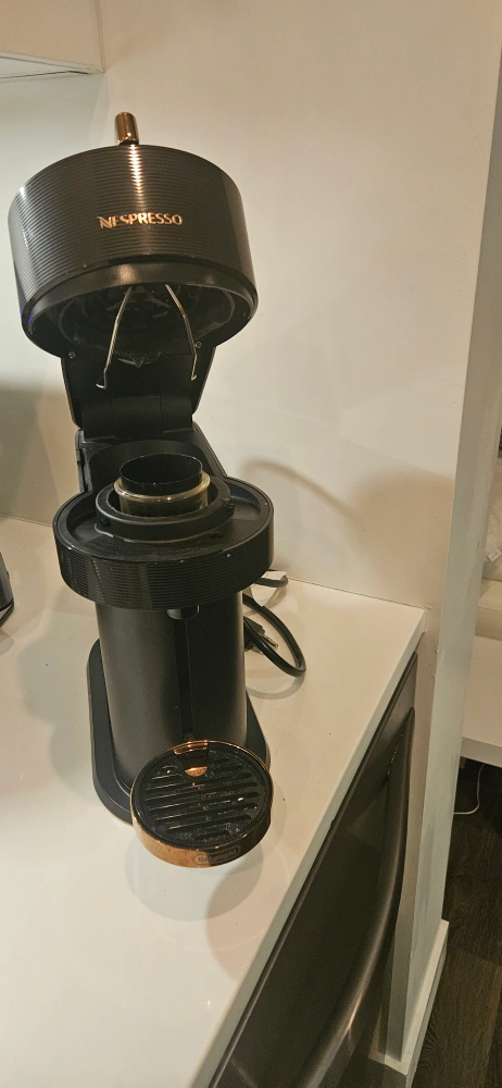83Compact espresso machine. Black and copper colour scheme. Used condition. Includes power cord. Drip tray visible.