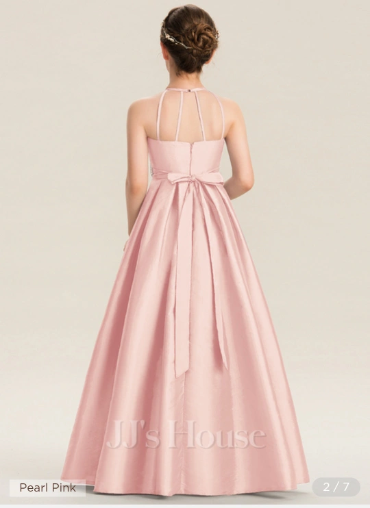 Beautiful pearl pink junior bridesmaid dress. Halter neck, A-line silhouette. Features a pleated skirt and embellished waistband. Back bow detail. Perfect for weddings or special occasions. Brand New. Bought for $120, Asking Price $60.