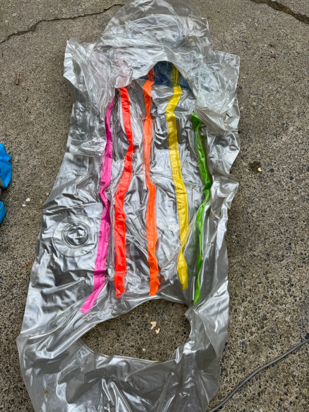 90Deflated vintage inflatable raft. Clear plastic with rainbow coloured stripes.