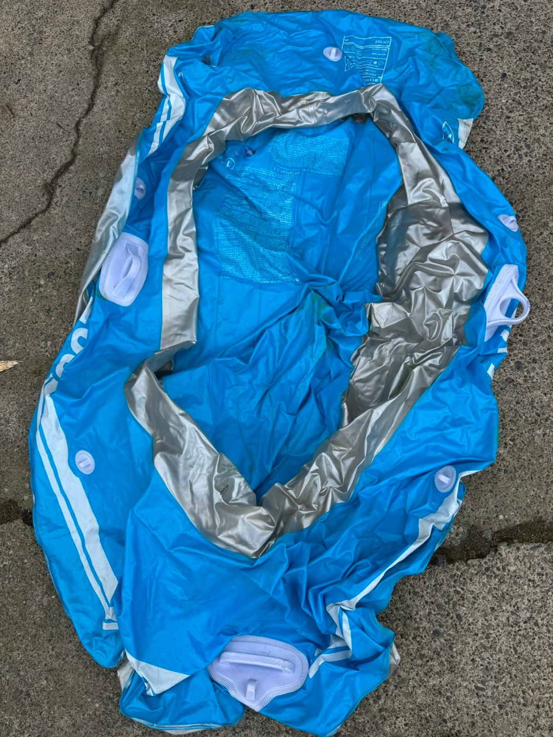 90Used inflatable pool raft. Blue and silver. Shows some wear. Good for summer fun!