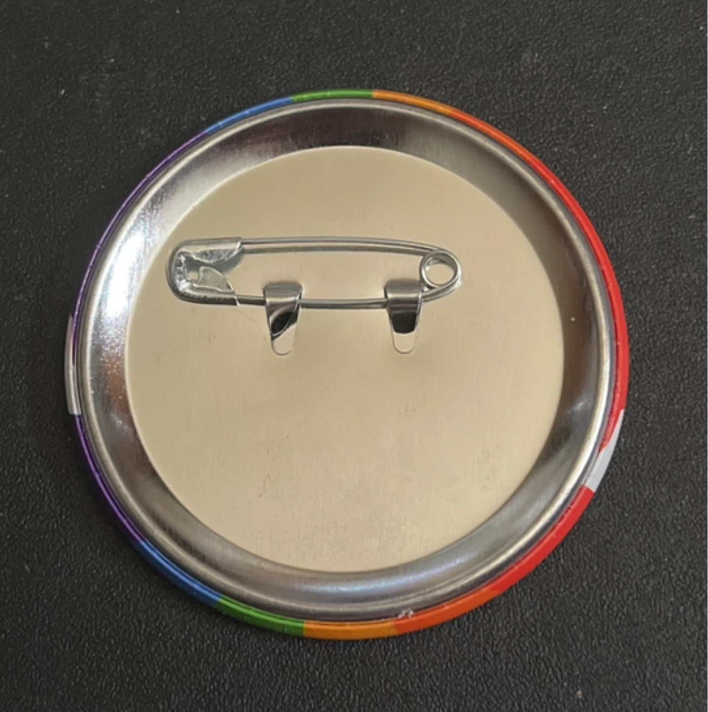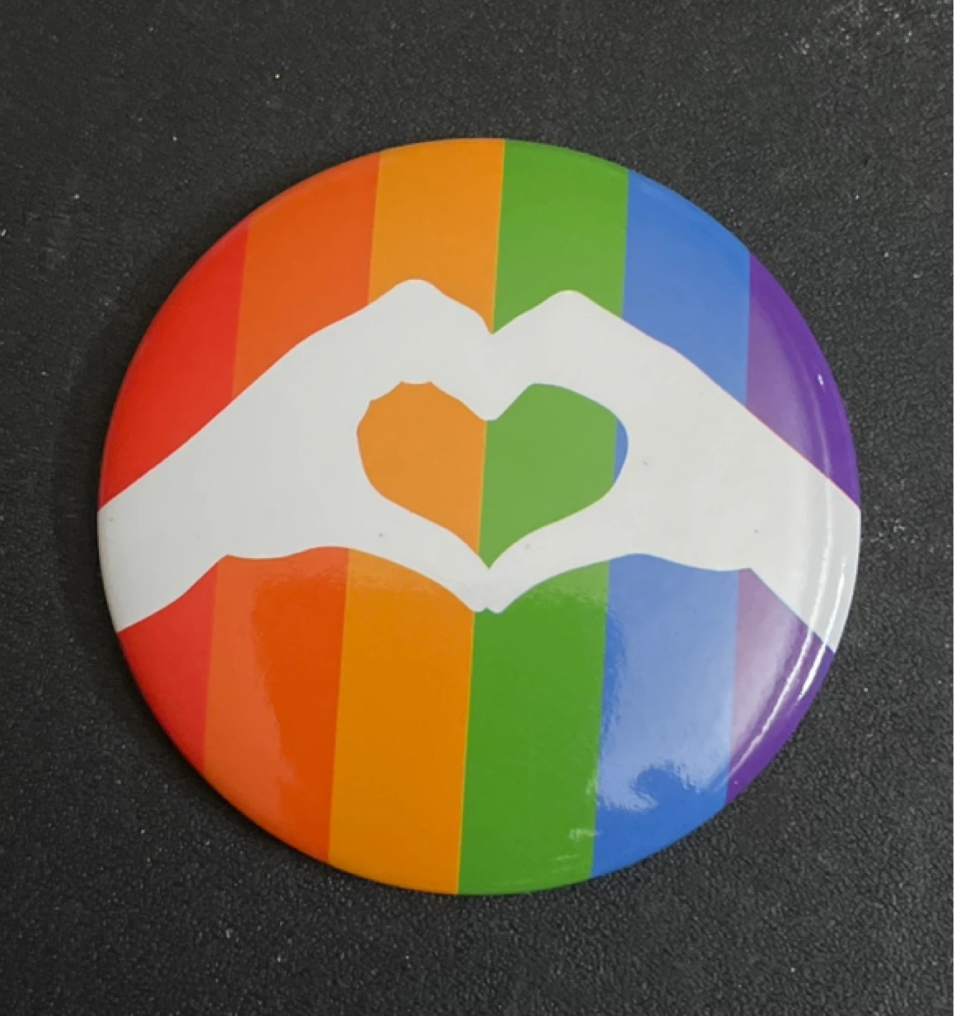 This round pin features a rainbow flag background with white hands forming a heart shape. It has a safety pin closure on the back. Show your support or pride with this colourful accessory!