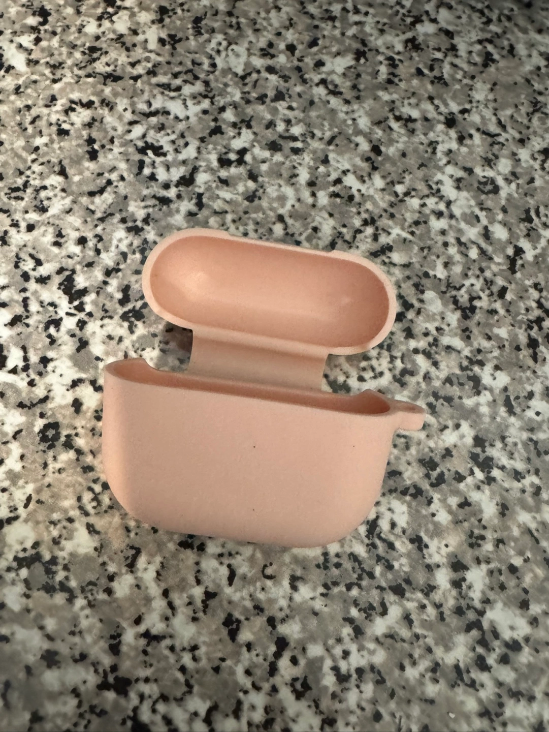 Protective silicone case for AirPods Pro. Blush pink colour. Includes a small loop for attaching a keychain or strap. Fits snugly over AirPods charging case.
