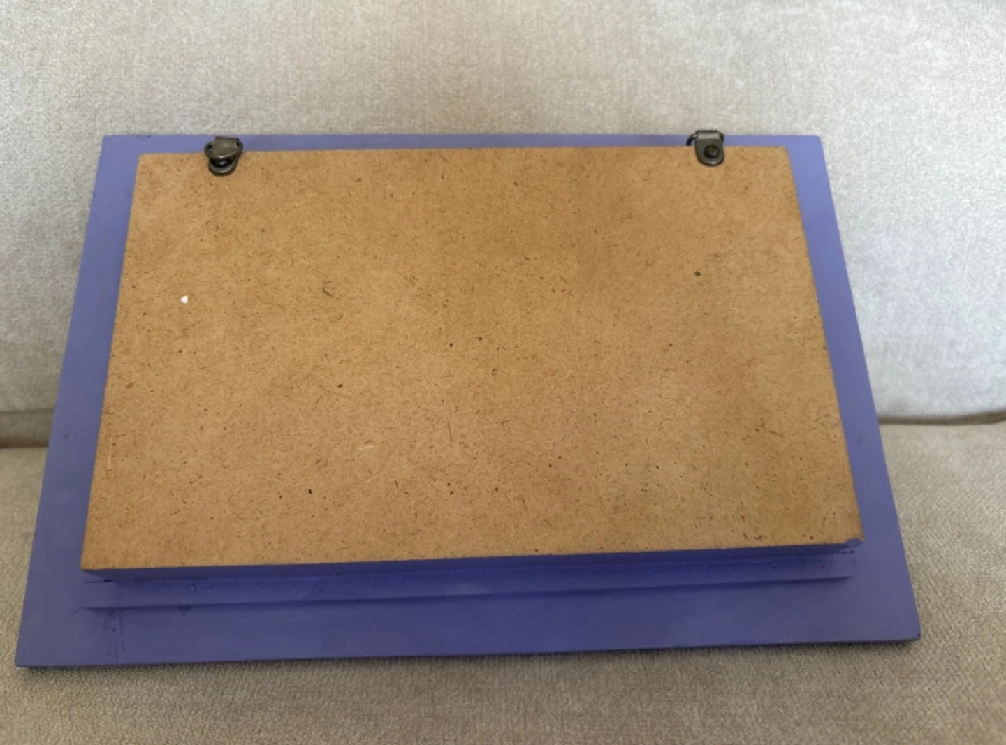 Cute beach-themed shadow box. Features a painted beach scene with miniature wooden accents. Perfect for a summery touch to your home decor. Light purple frame.