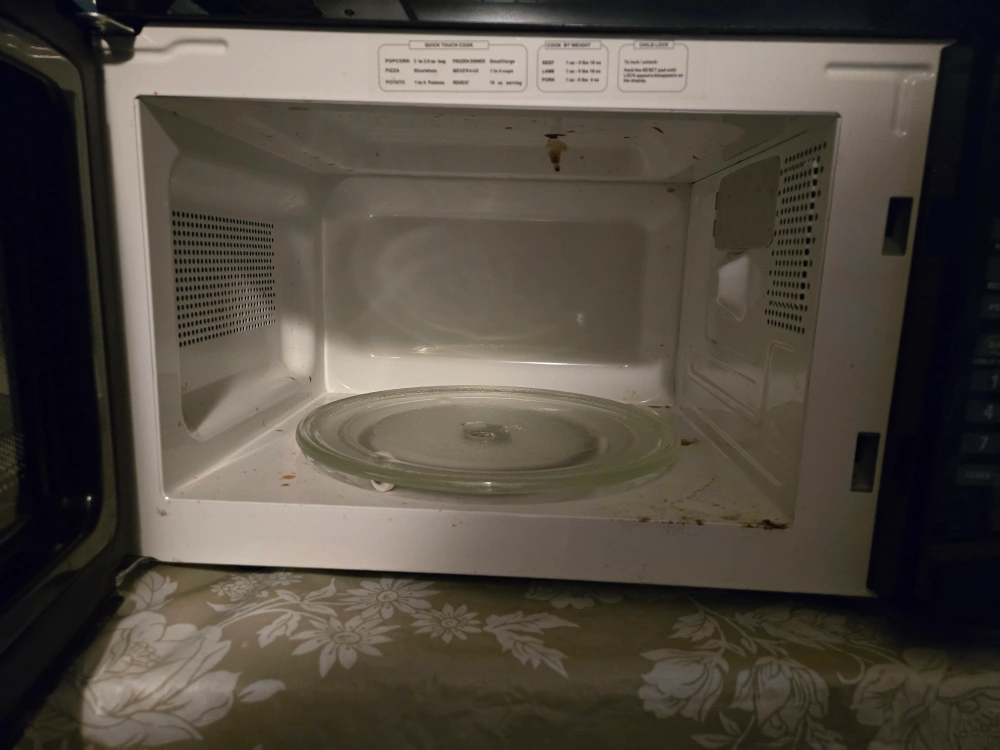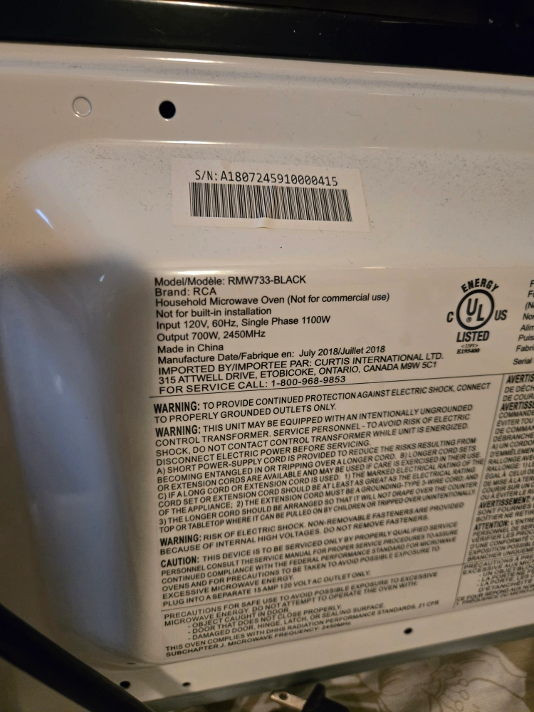 Black microwave. Digital controls. Pre-programmed settings. Turntable. 1100W. Model RMW733-BLACK. Just needs a little TLC