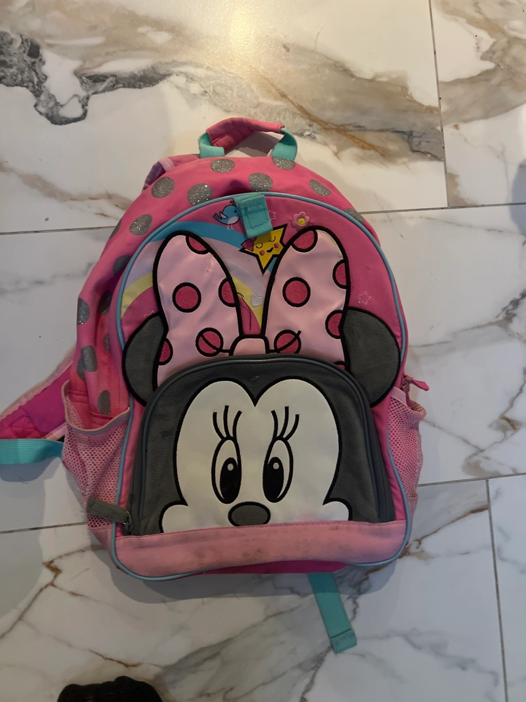 Cute Minnie Mouse backpack. Pink with grey accents. Features Minnie's face. Small side pockets. Zipper closure. Great for preschool or daycare.