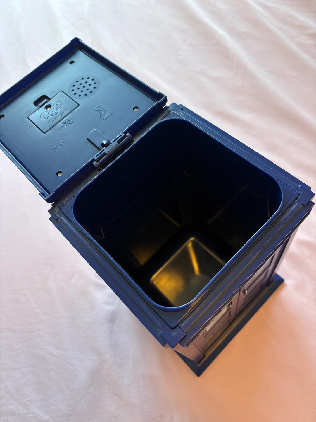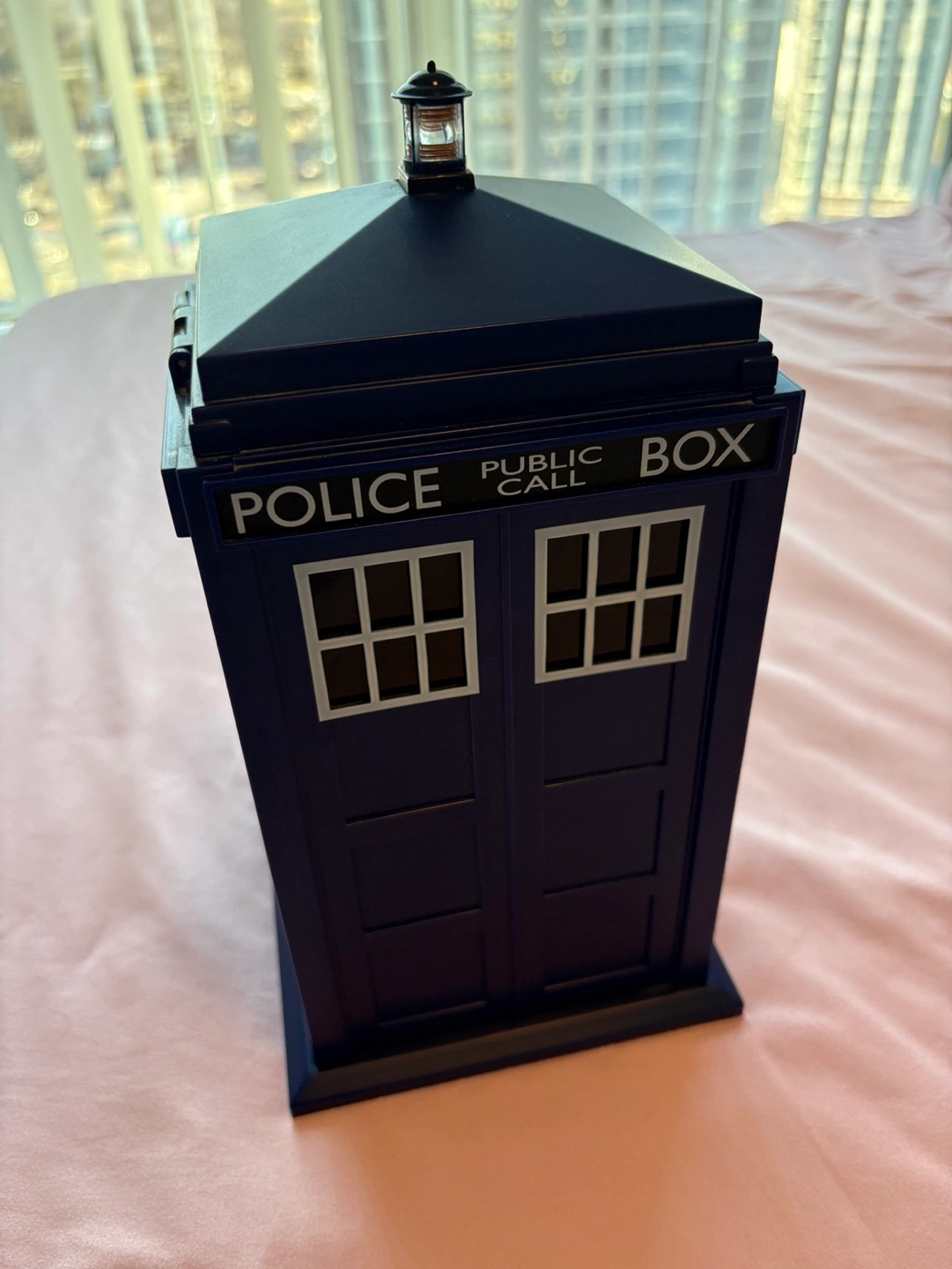 Blue TARDIS-shaped piggy bank. Batteries are dead but when replaced it makes TARDIS sound effects. Opens from the top. Great for Doctor Who fans. Pick up near Islington Station.