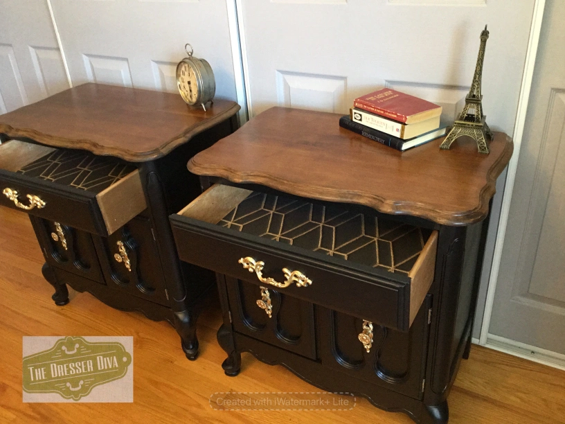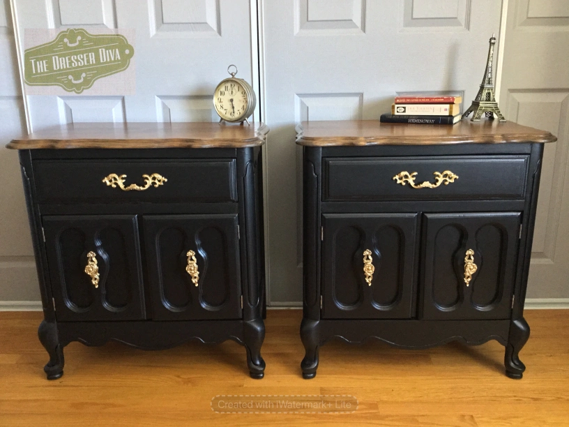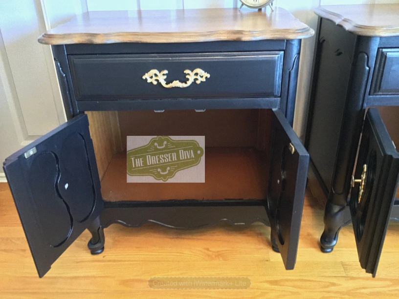 Two matching nightstands. Black finish with wood top. Gold-toned hardware. French provincial style. Two doors and one drawer per nightstand.