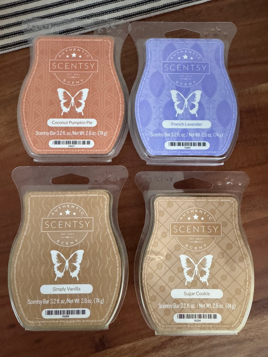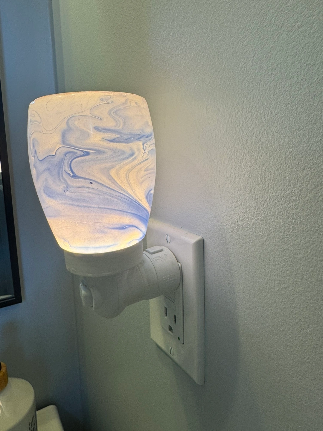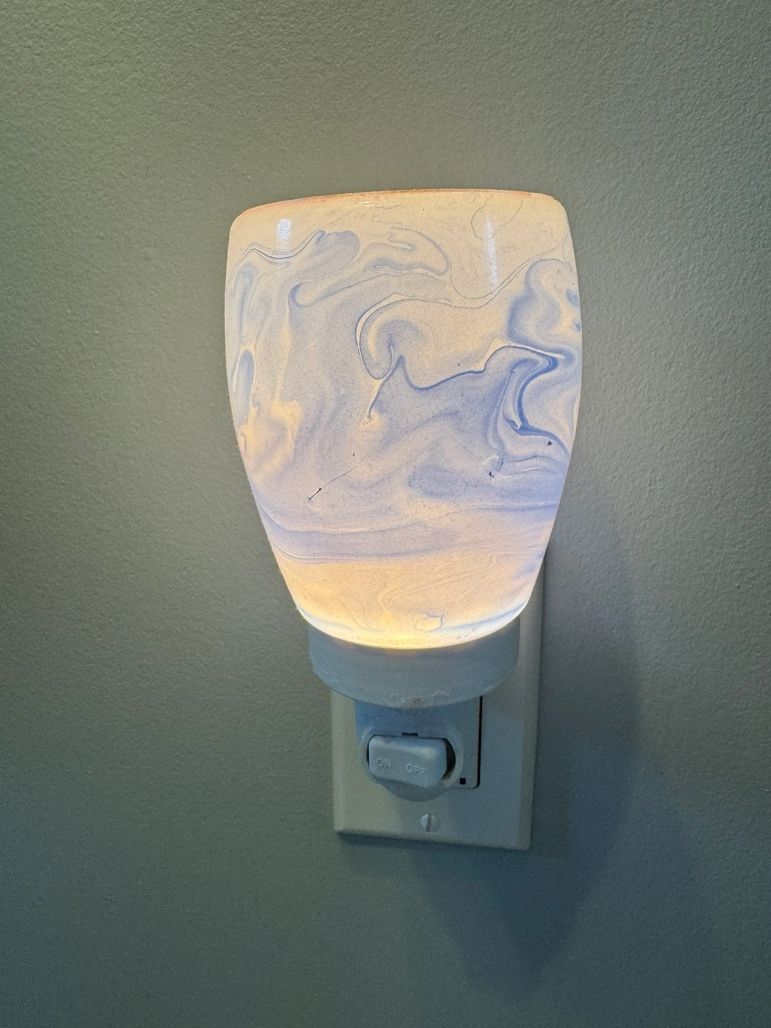 Scentsy plug-in warmer, blue marble design. Includes never opened, brand new four Scentsy bars: Coconut Pumpkin Pie, French Lavender, Simply Vanilla, and Sugar Cookie. Great for adding fragrance to any room.