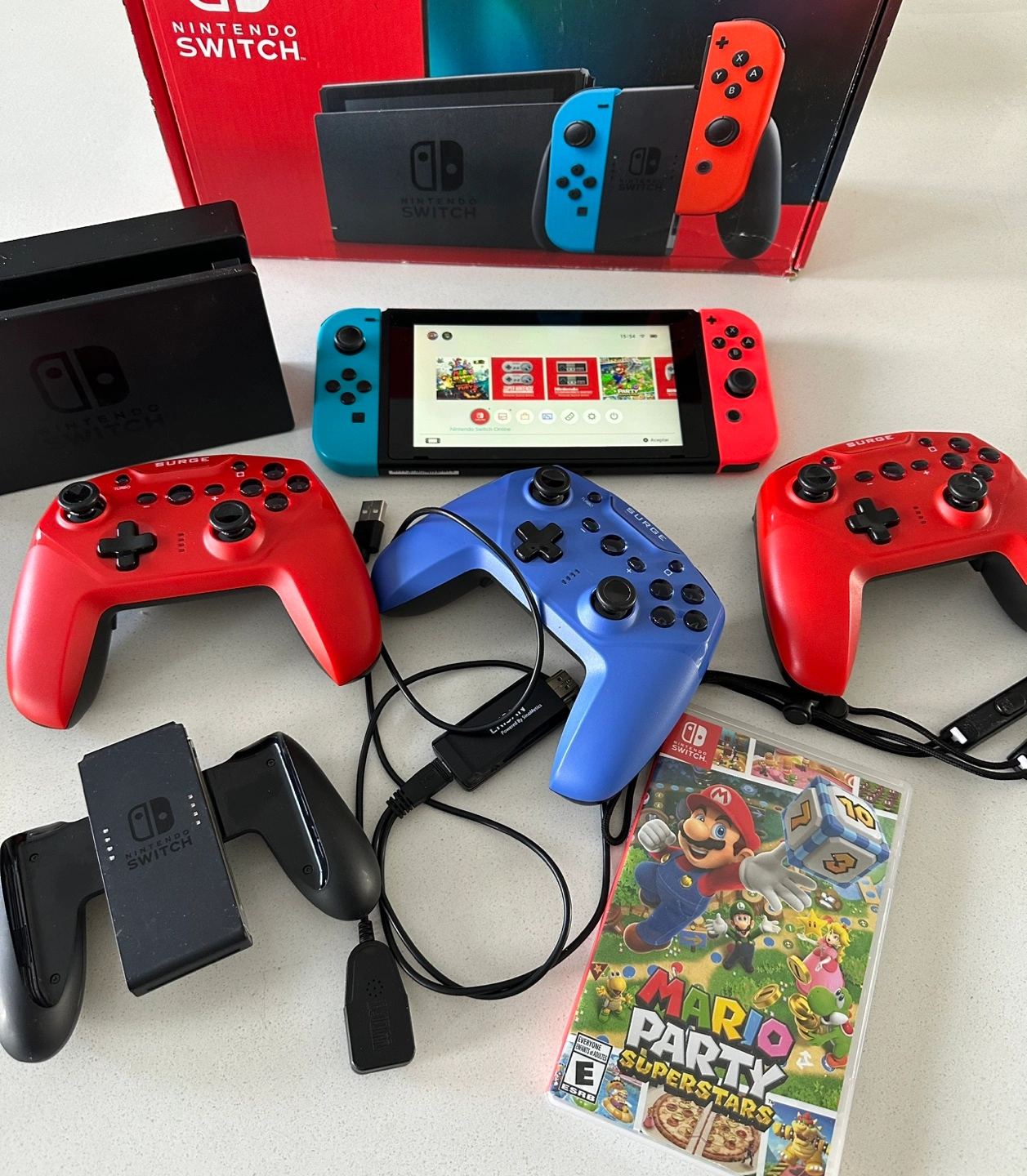 Nintendo Switch console, two Surge wireless controllers, a black Nintendo Switch grip, Mario Party Superstars game, and additional accessories included. Great for gaming.