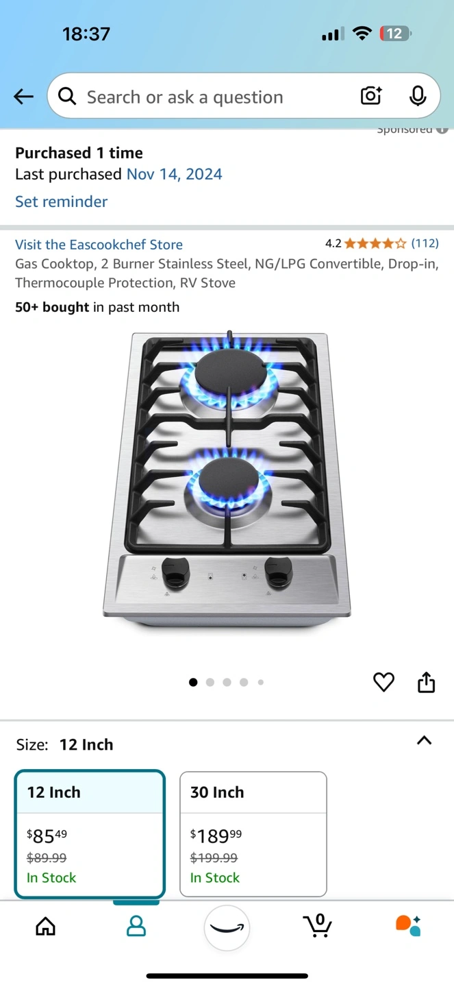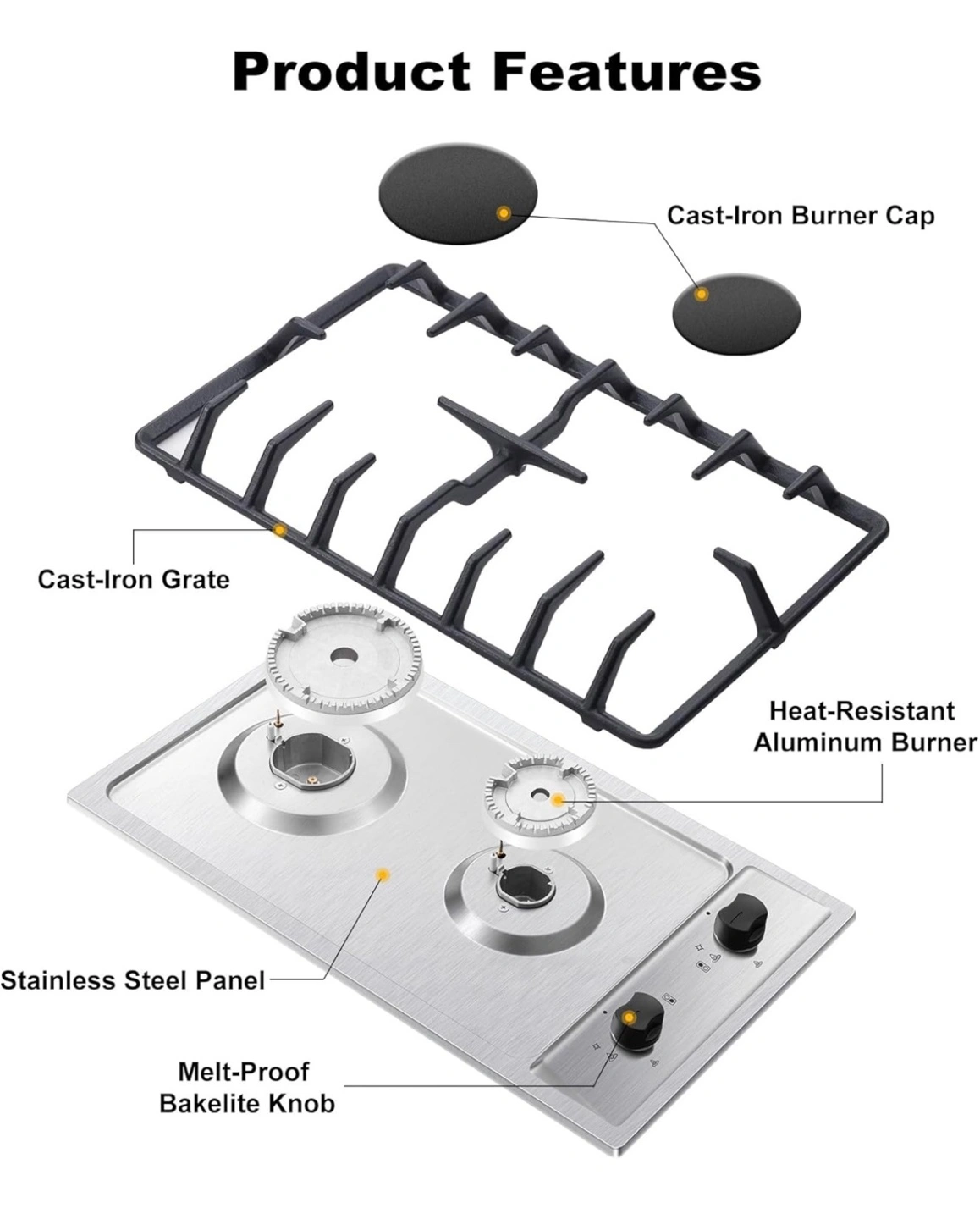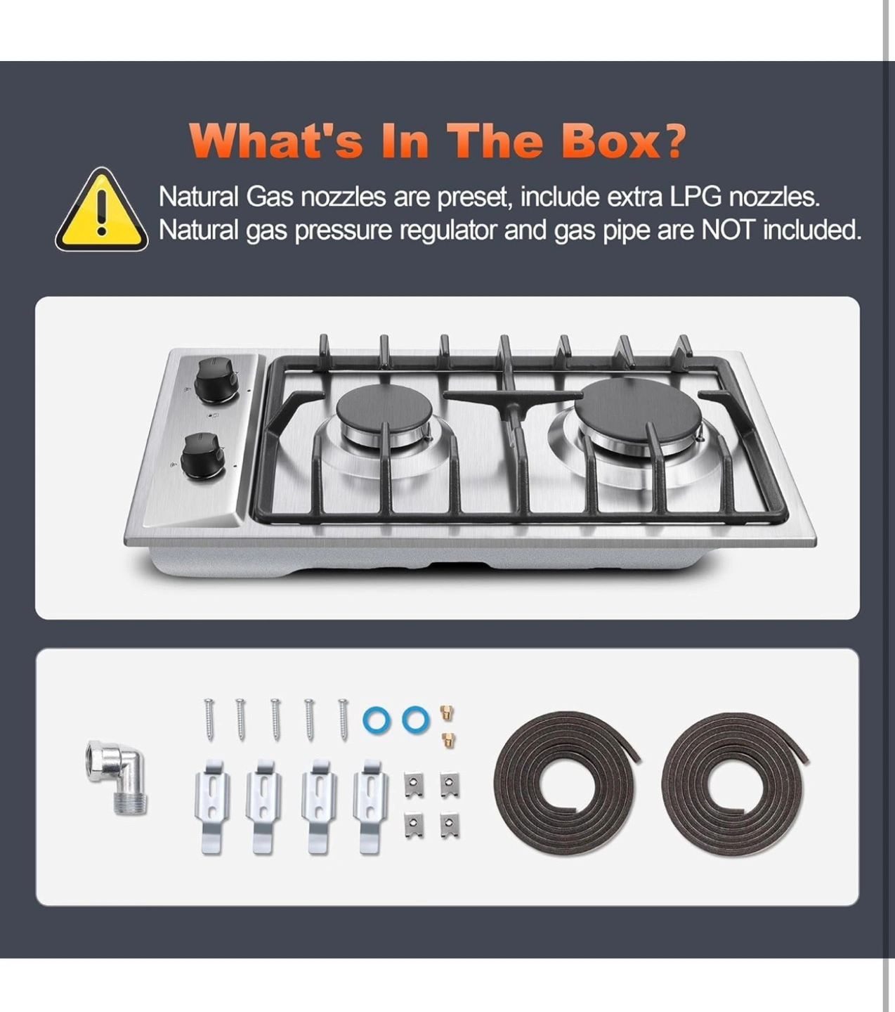 12 inch 2 burner gas cooktop. Stainless steel. NG/LPG convertible. Drop-in. Thermocouple protection. Includes extra LPG nozzles. Natural gas pressure regulator and gas pipe not included. New in the box, never used!
