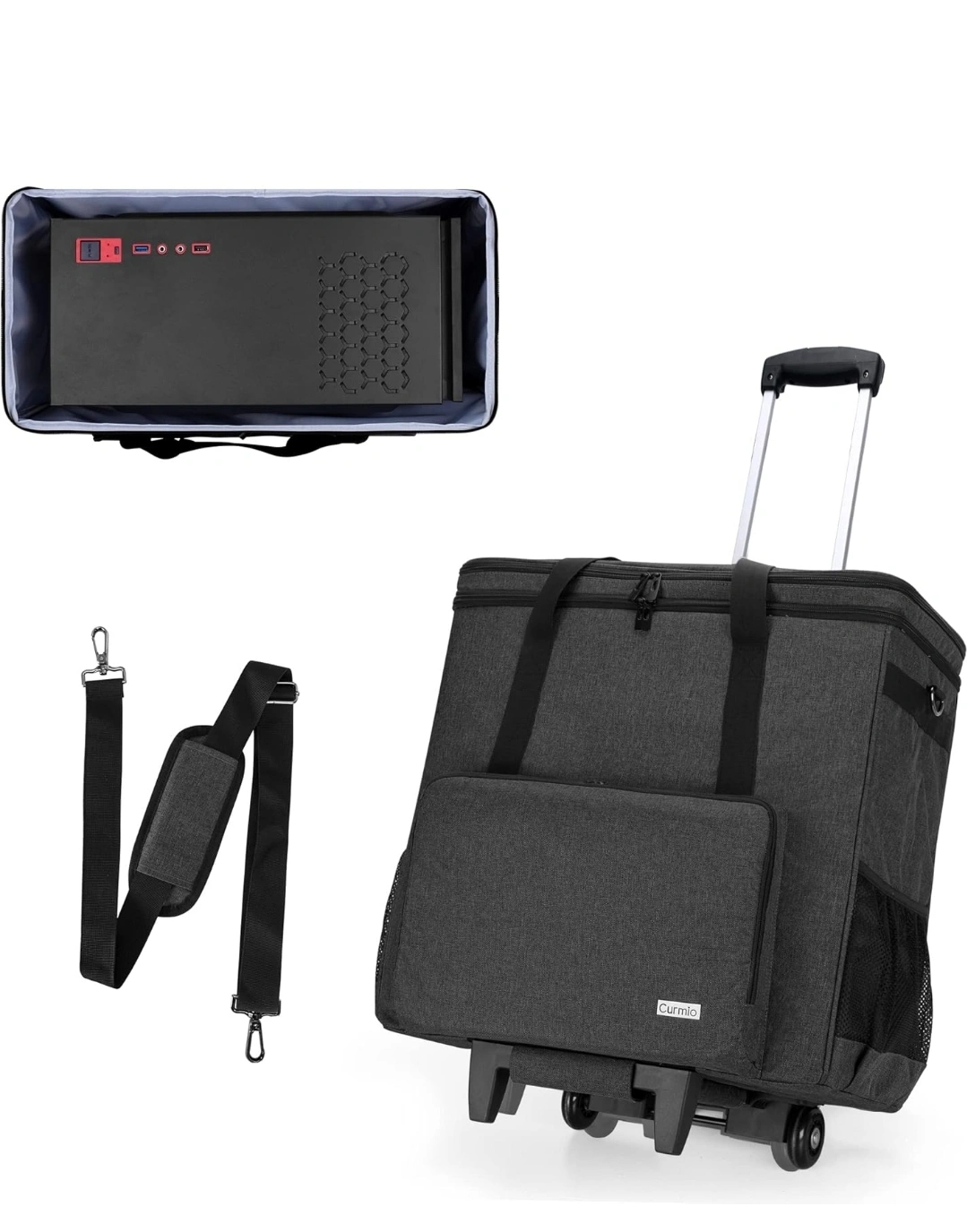 Grey fabric portable storage tote. Features multiple interior and exterior pockets, a zippered closure, and a removable shoulder strap. Includes rolling wheels and a pull-up handle for easy transport.