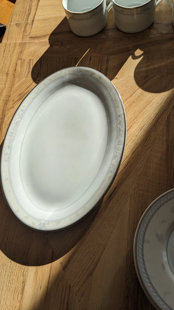 Elegant Mikasa Romance dinnerware. Includes 8 dinner plates( one has a small chip) , eight salad plates, eight soup bowls, and six mugs. Subtle grey and gold detailing. Beautiful set for everyday use or special occasions.