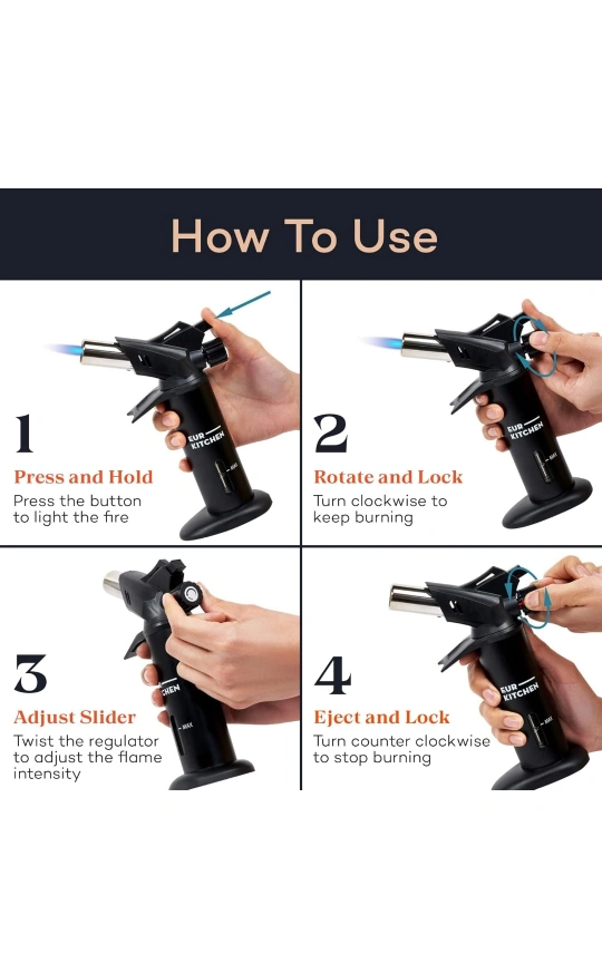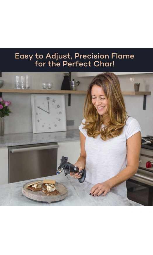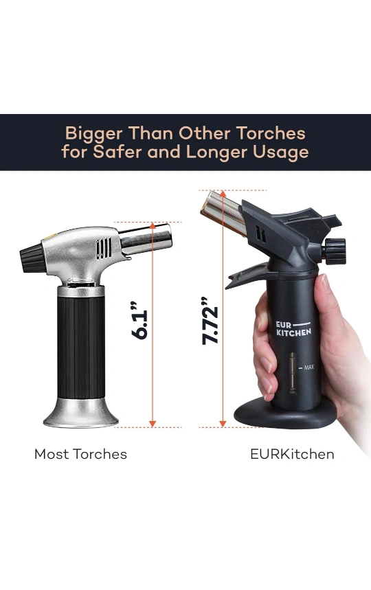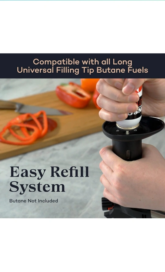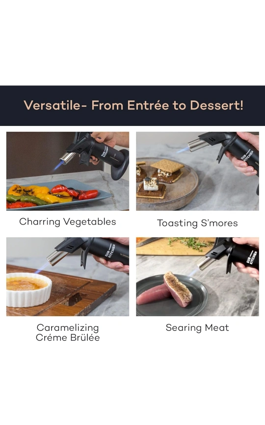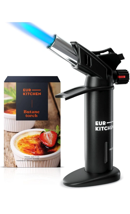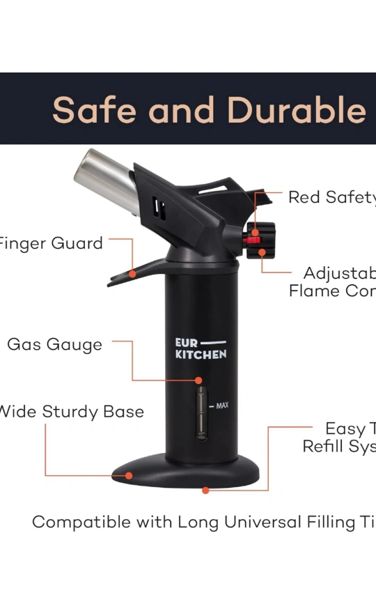 143Butane kitchen torch. Features adjustable flame control, wide sturdy base, and easy refill system. Piezo ignition. Durable and safe. Perfect for crème brûlée and other culinary applications.