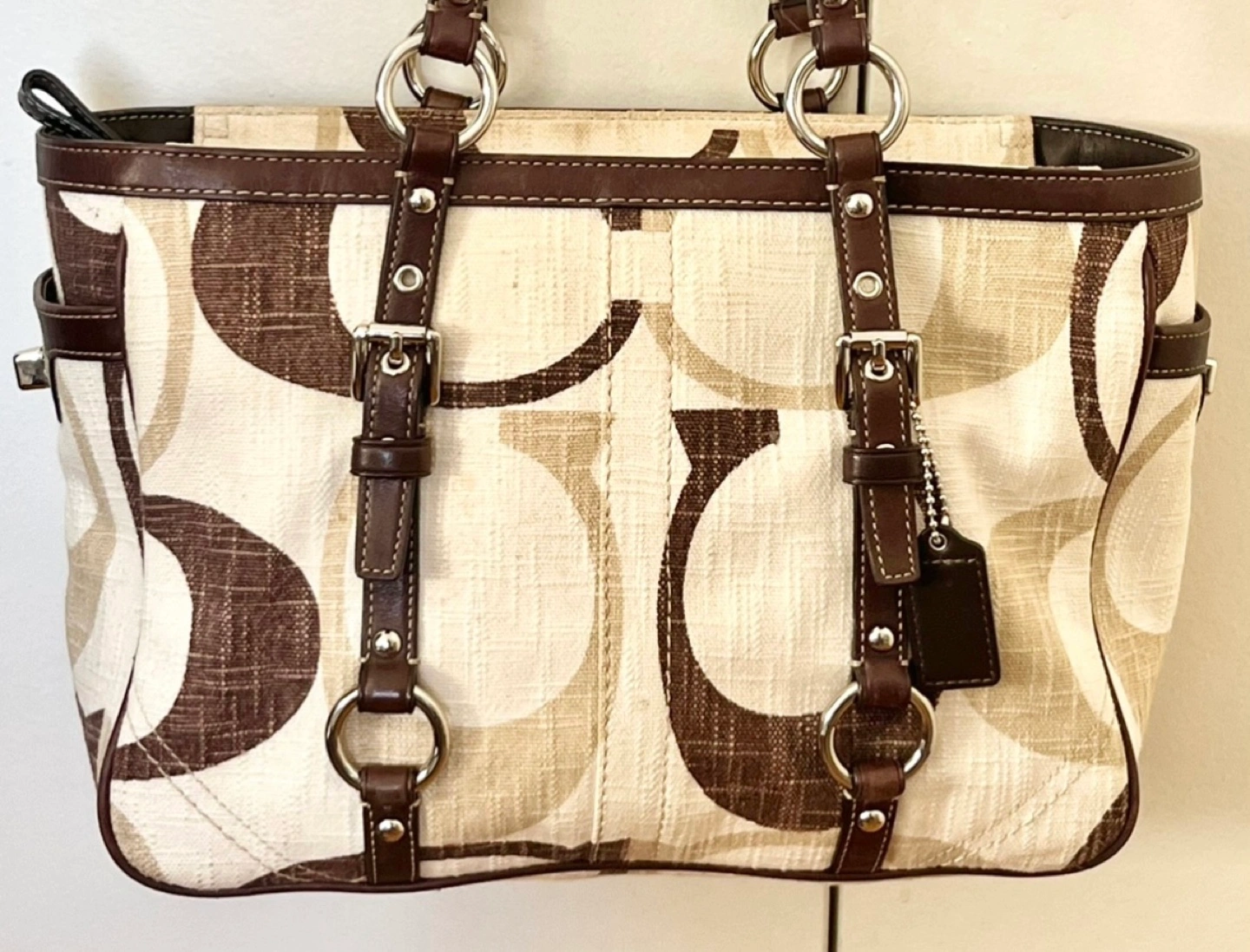 Beige and brown signature C print canvas tote bag. Brown leather trim and handles. Top zipper closure. Exterior pocket. Interior pockets. Good condition.