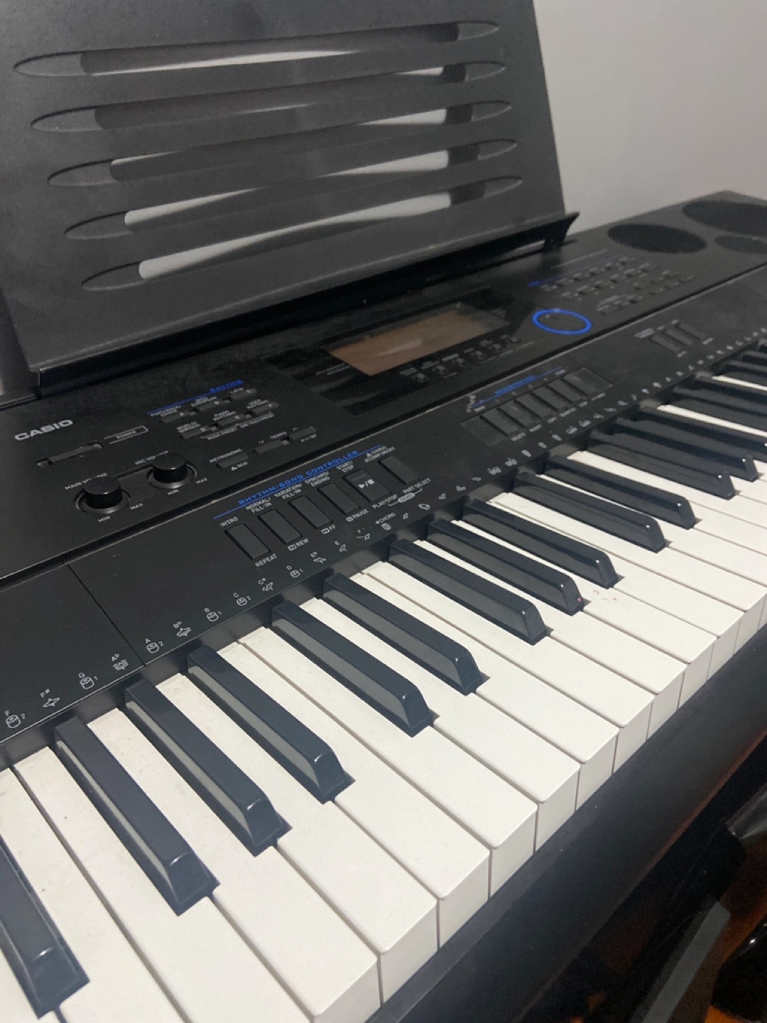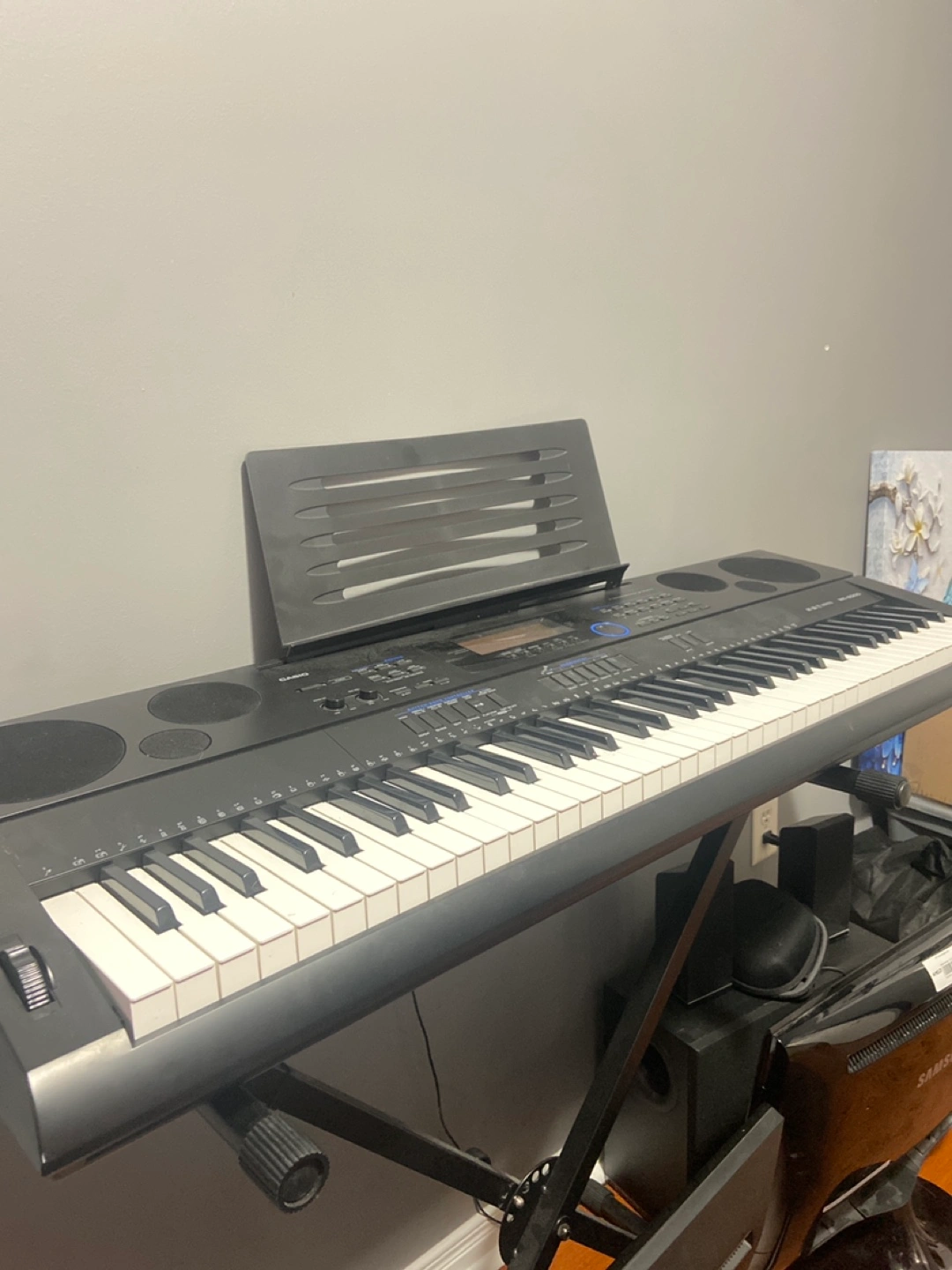 61-key keyboard. Includes stand. Great for beginners or experienced players. Features various sounds and rhythms.