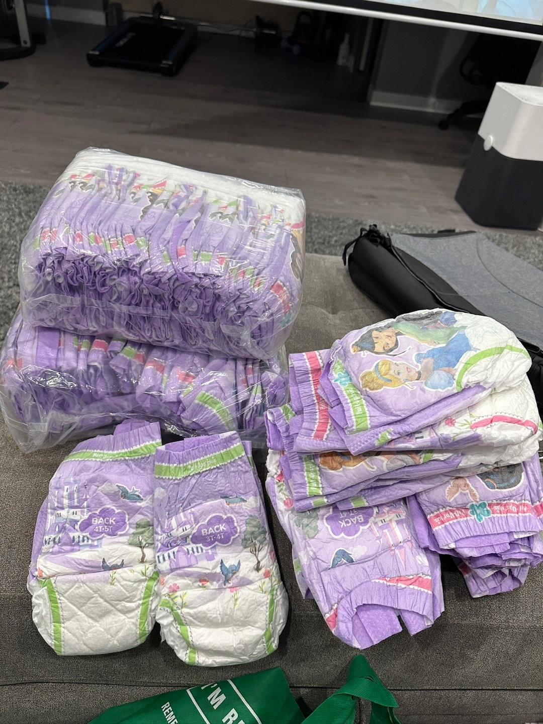 Lots of princess themed Pull ups. Sizes range from 3-4 and 4-5. 2 new sleeves and another 20 loose. About 75 diapers in total
