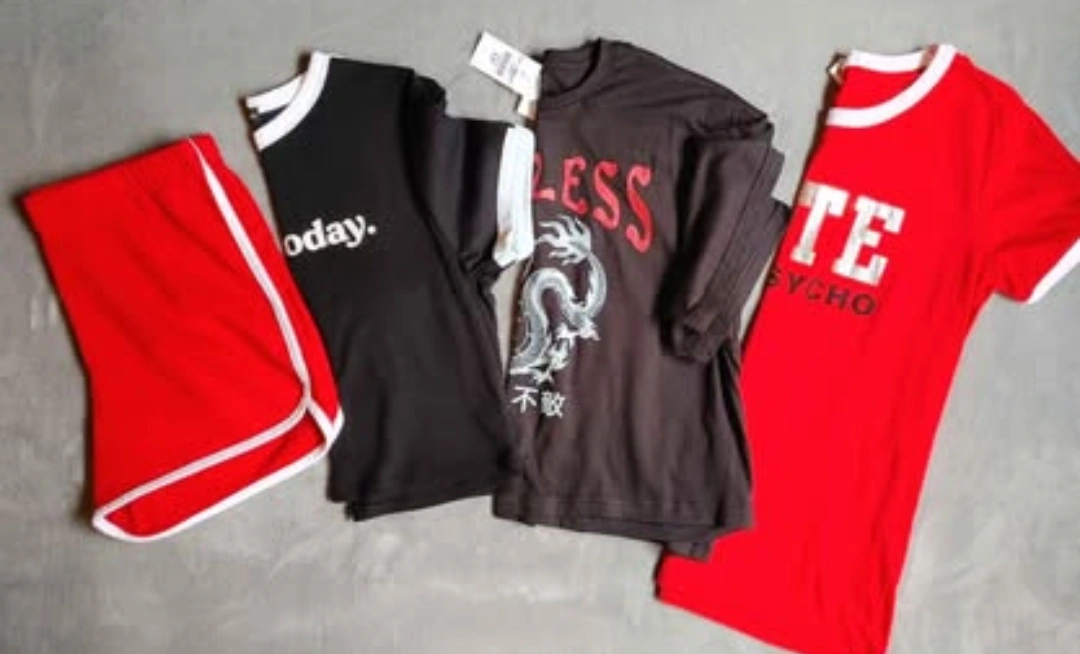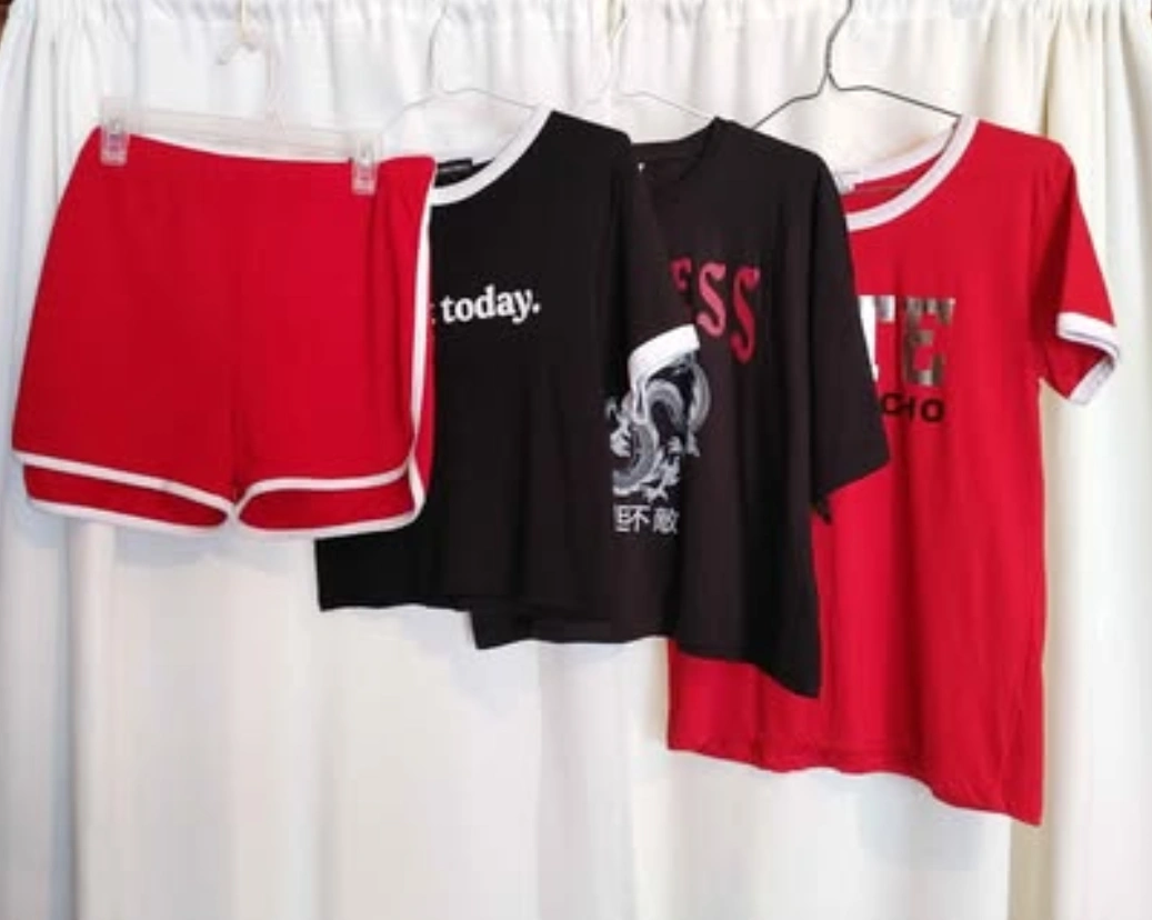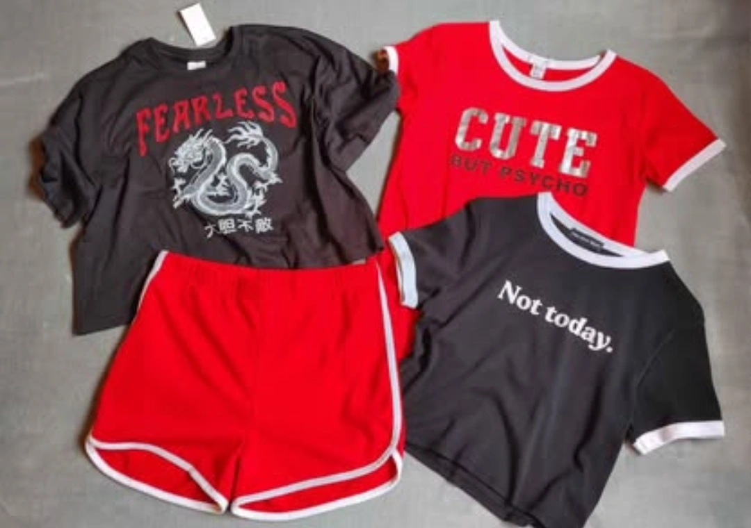 Bundle includes three graphic t-shirts and a pair of red shorts. Stretchy, high rise Red shorts have white trim. Two Black crop top tees feature a dragon graphic and Japanese characters, the other top says "Not today." The third tee, regular t-shirt length, is red and says "Cute but psycho."