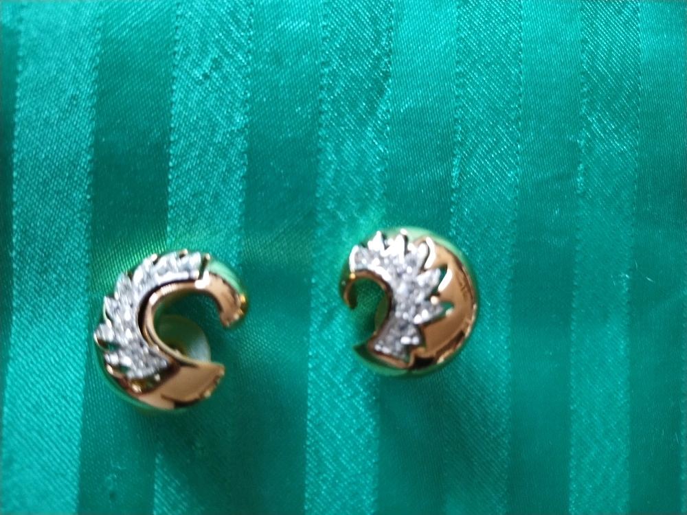 Pair of gold tone earrings Features a crescent moon design accented with clear stones. Elegant and subtle.