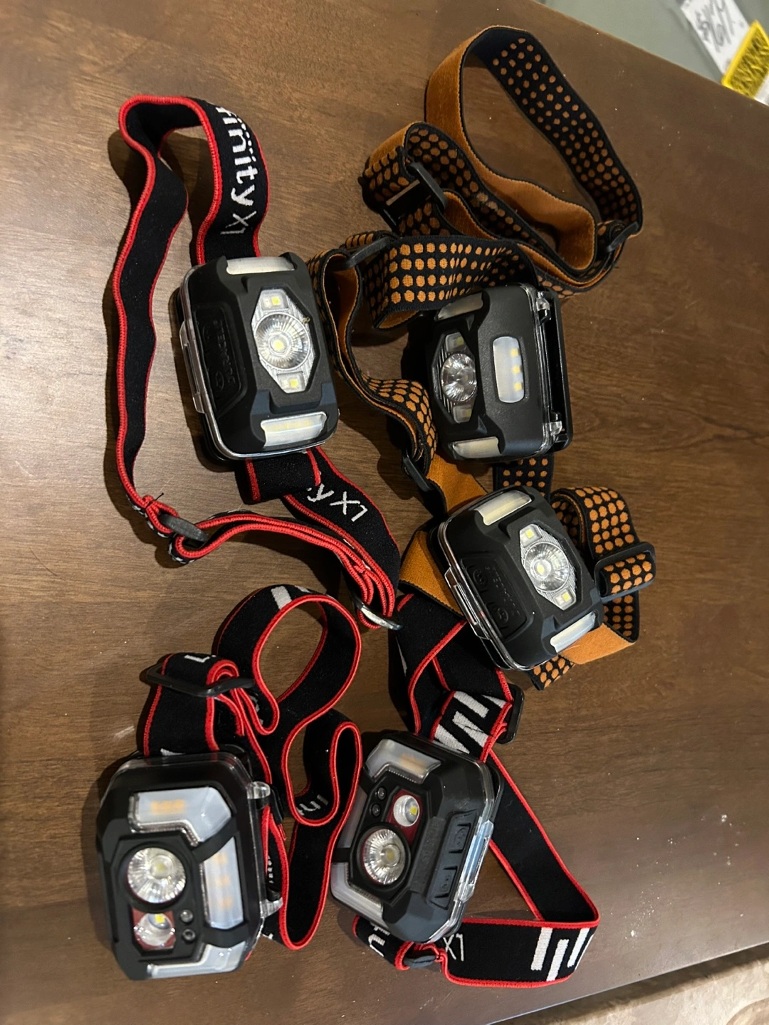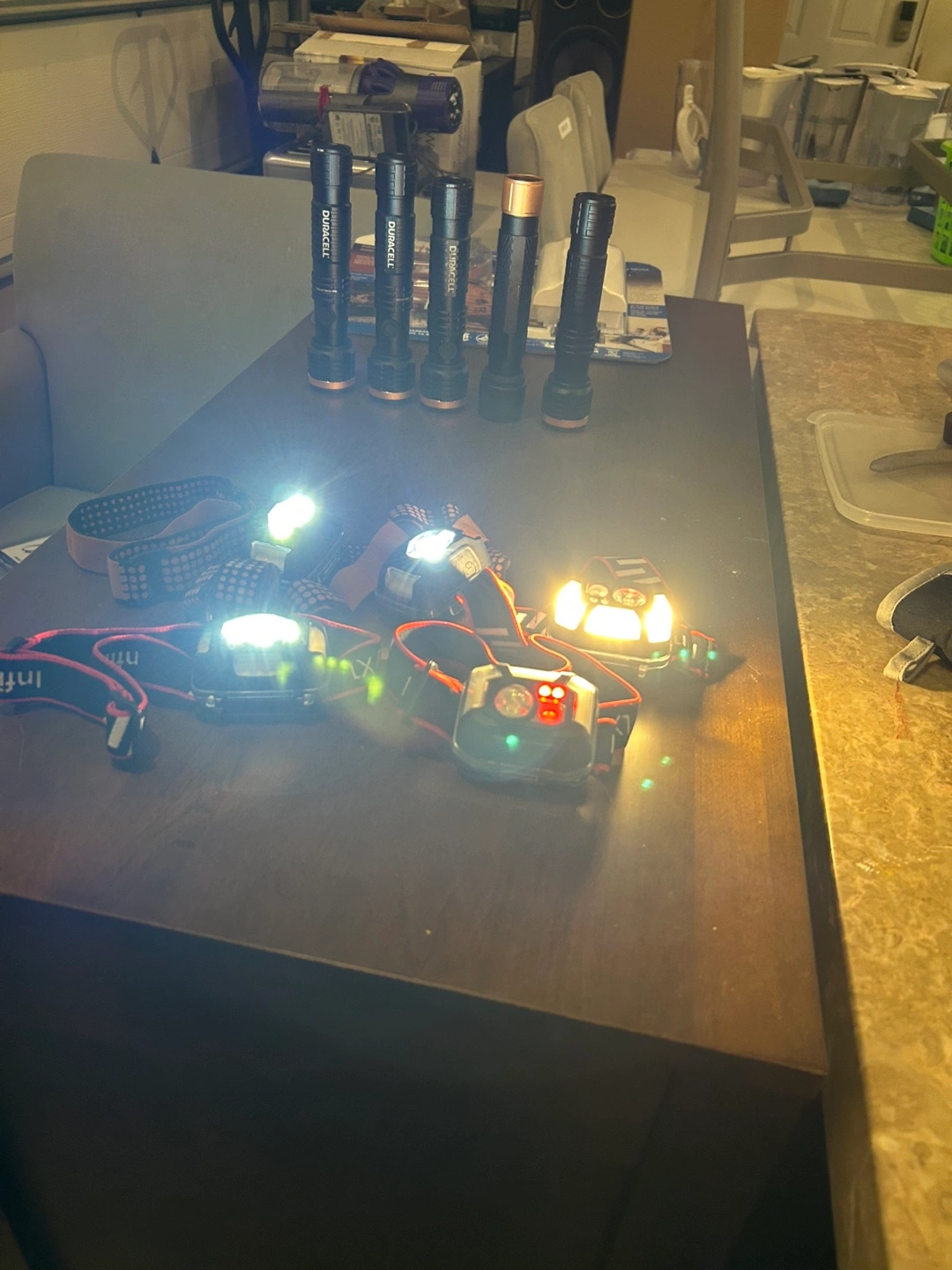Five Duracell flashlights and five headlamps. Various models. Great for camping, hiking, or emergencies. Sold as a lot for $50 or $5 a headlamp and $7.50 for flashlight