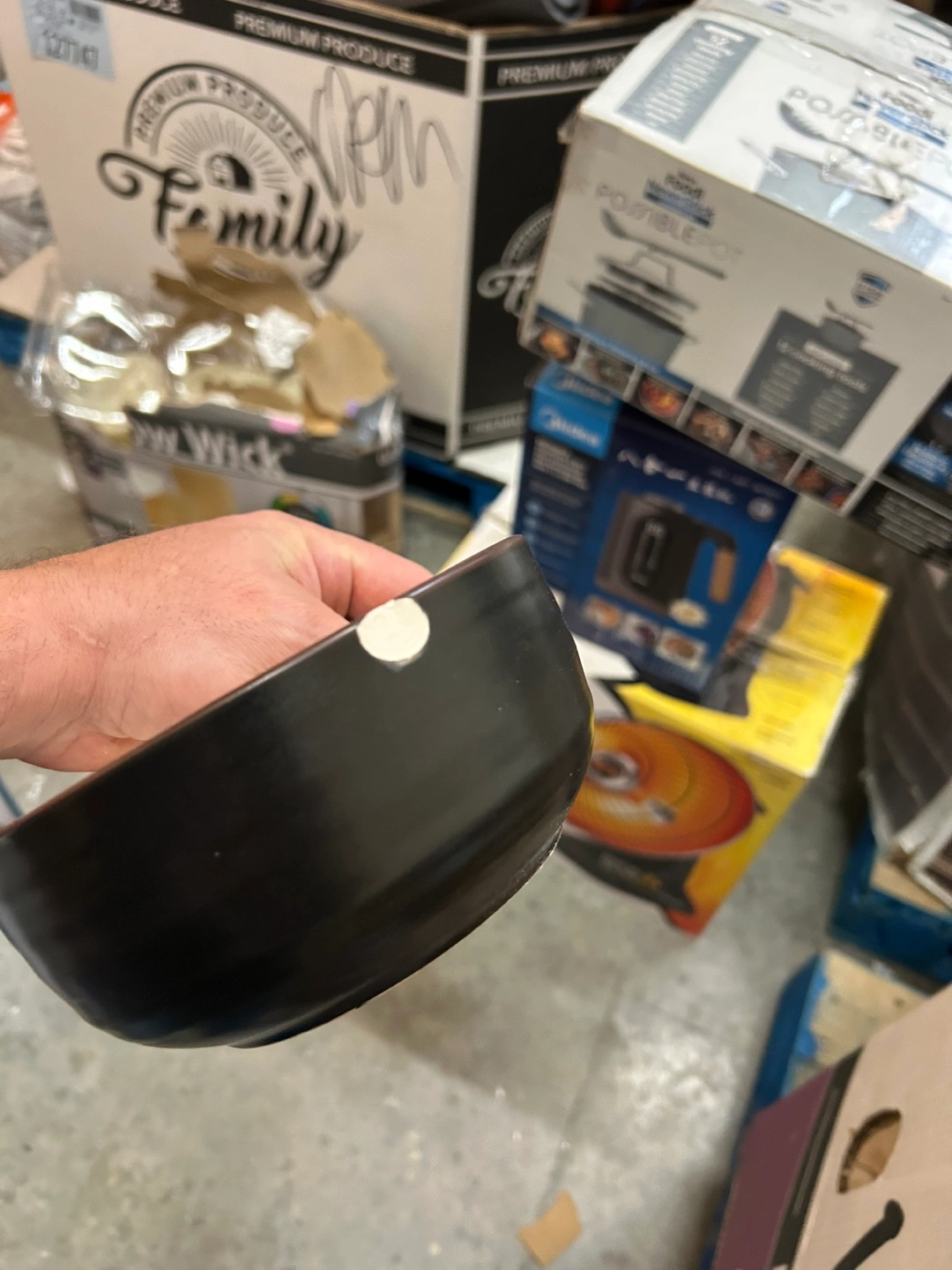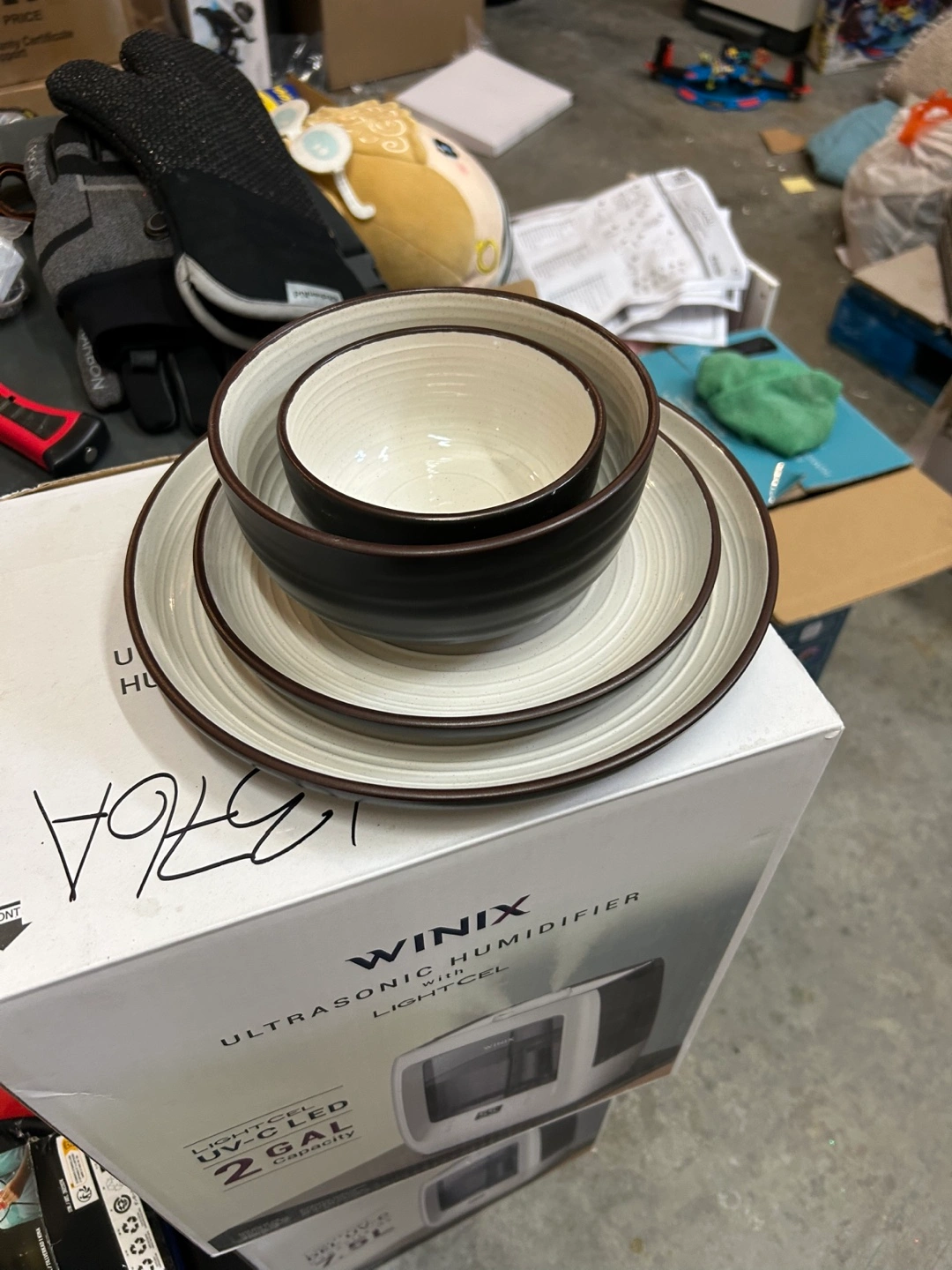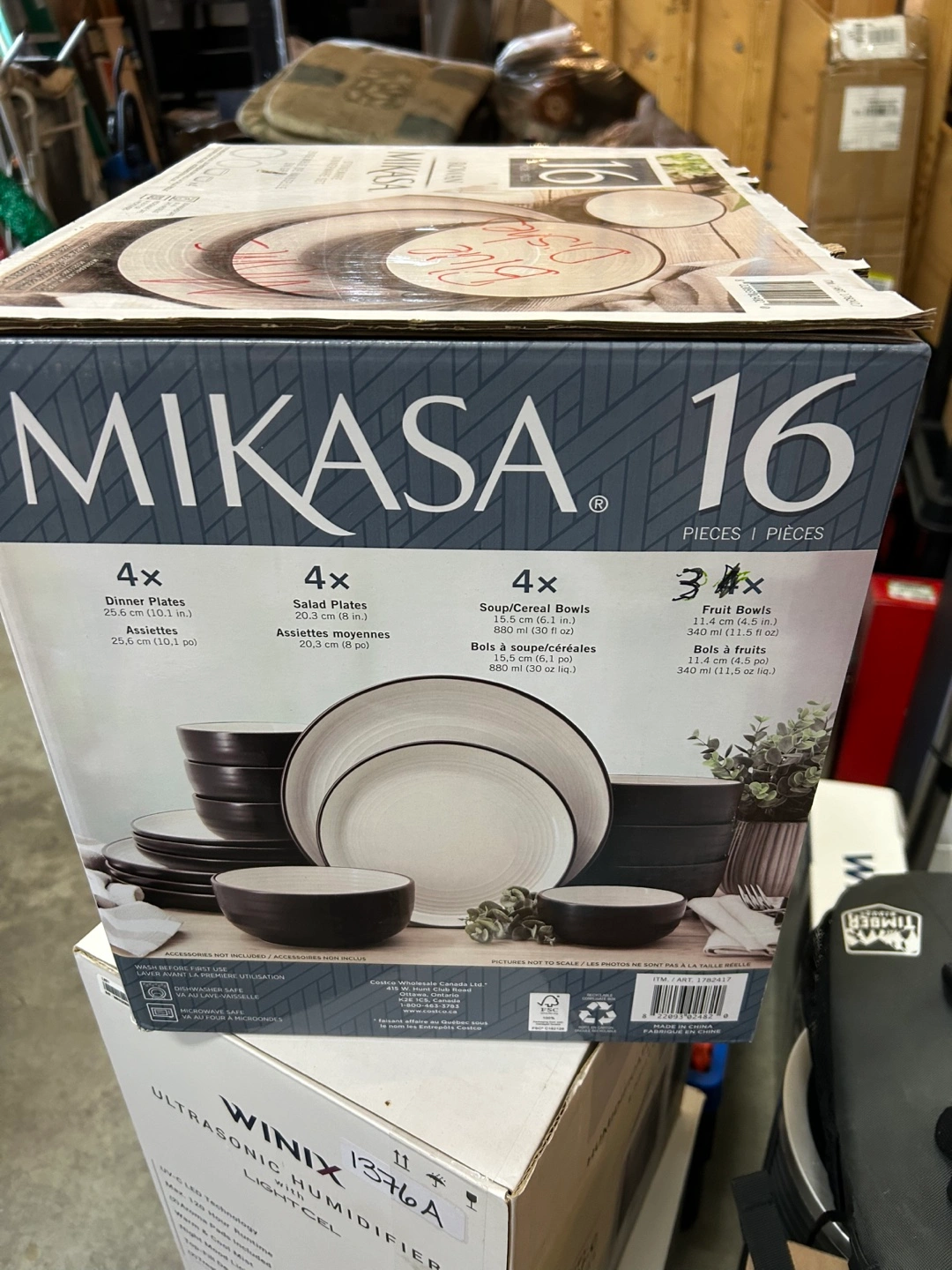 New in box. 16-piece dinnerware set. Includes dinner plates, salad plates, bowls, and cereal bowls. Stoneware material. Microwave and dishwasher safe.one has a chip and the small bowl only has 3