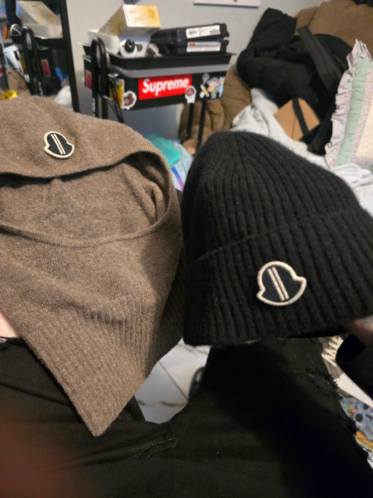 Pair of Rick Owens knit beanies. Collaberation with Moncler. One black, one taupe. Excellent condition. Soft, warm material. Perfect for winter, yet breathable enough for summer. Black one is 90%cashmere 10%wool. Dustx30 skizzi is the opposite. both purchased by myself, from Ssense. Proof, bags, tags, etc. provided. 450ish each retail, I'll do both for 300 or 180 each.