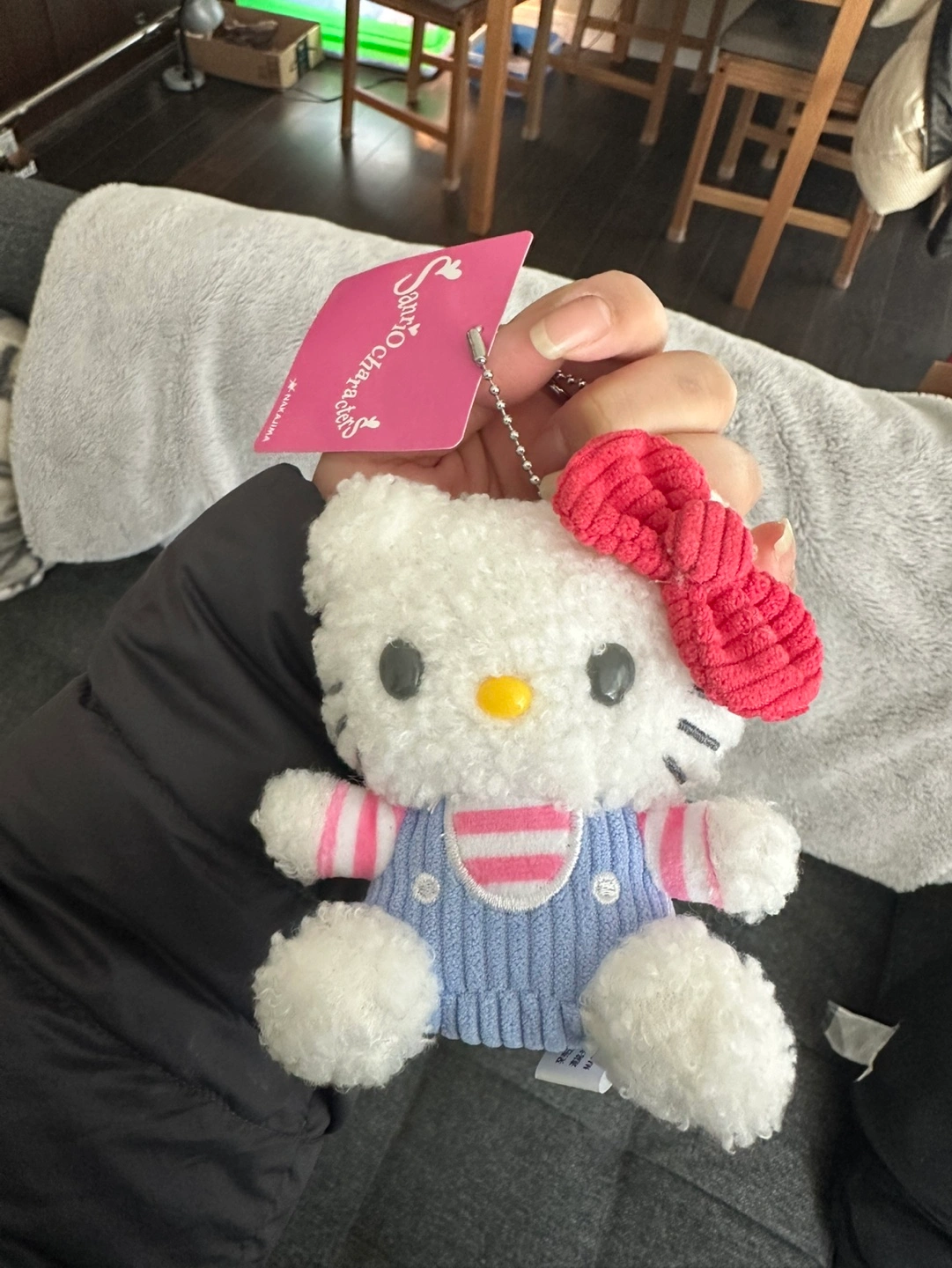 119Adorable Hello Kitty plush keychain. Soft, fluffy texture. Light blue corduroy overalls. Pink bow. Perfect for bags or keys.