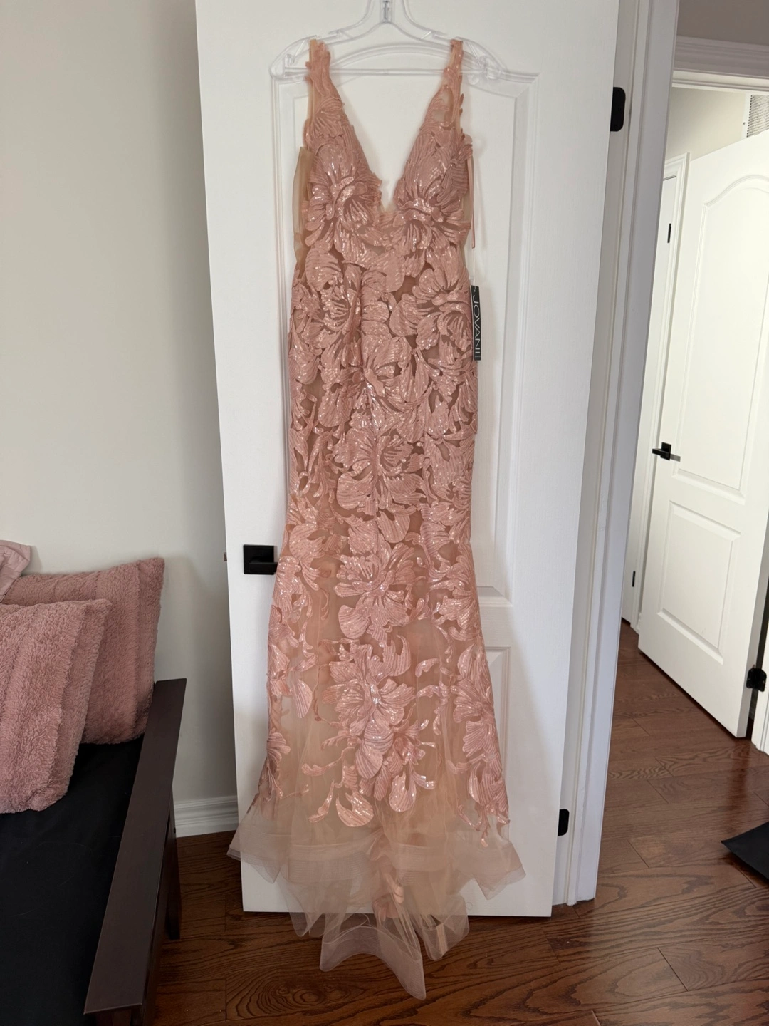 Stunning brand new never been worn rose gold sequined floral gown. Features a V-neck and fitted silhouette. Floor-length with a slight train. New with tags.