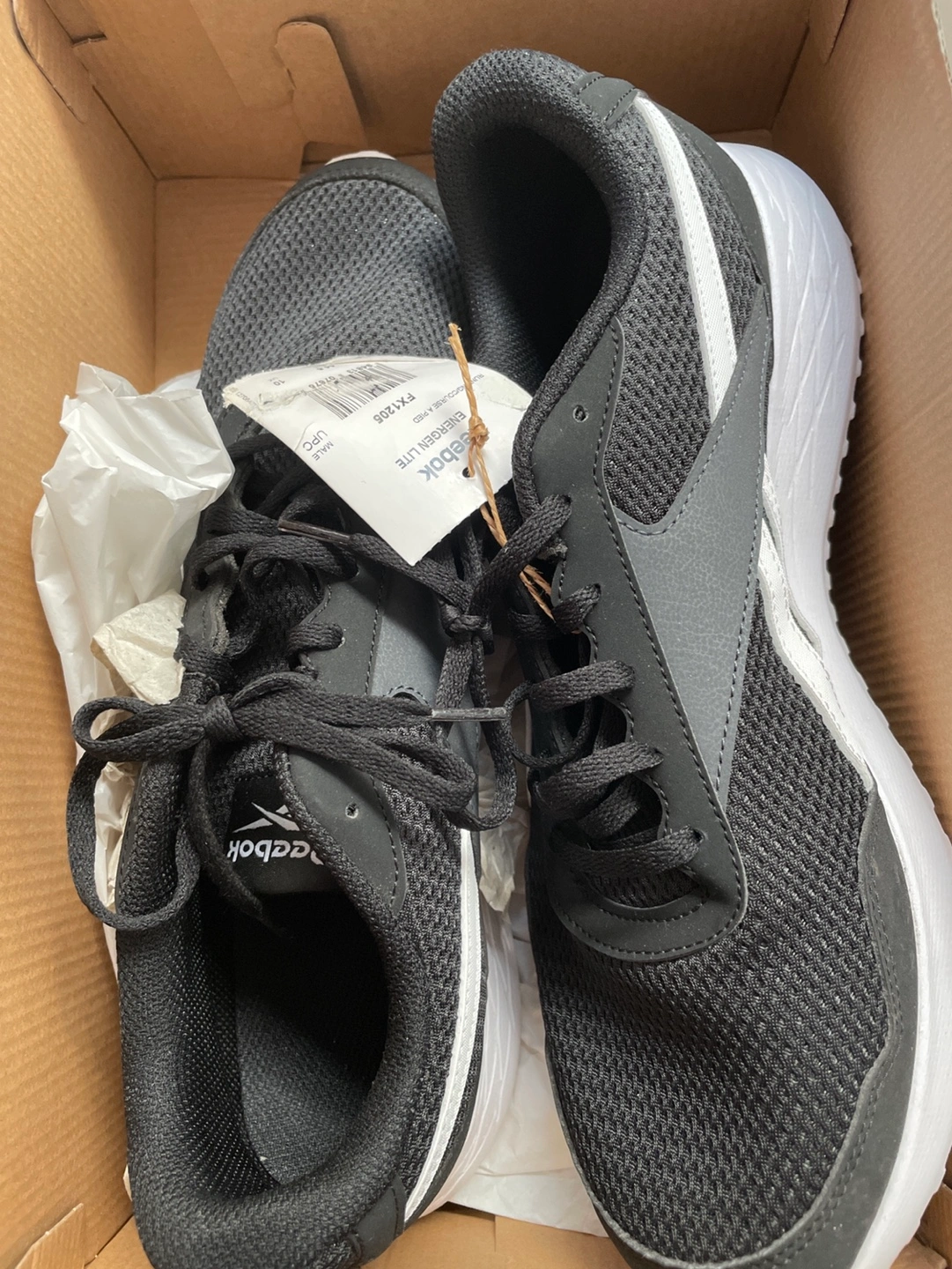 Pair of black Reebok Energen Lite running shoes. Mesh upper, white accents. Lace-up closure. New in box.