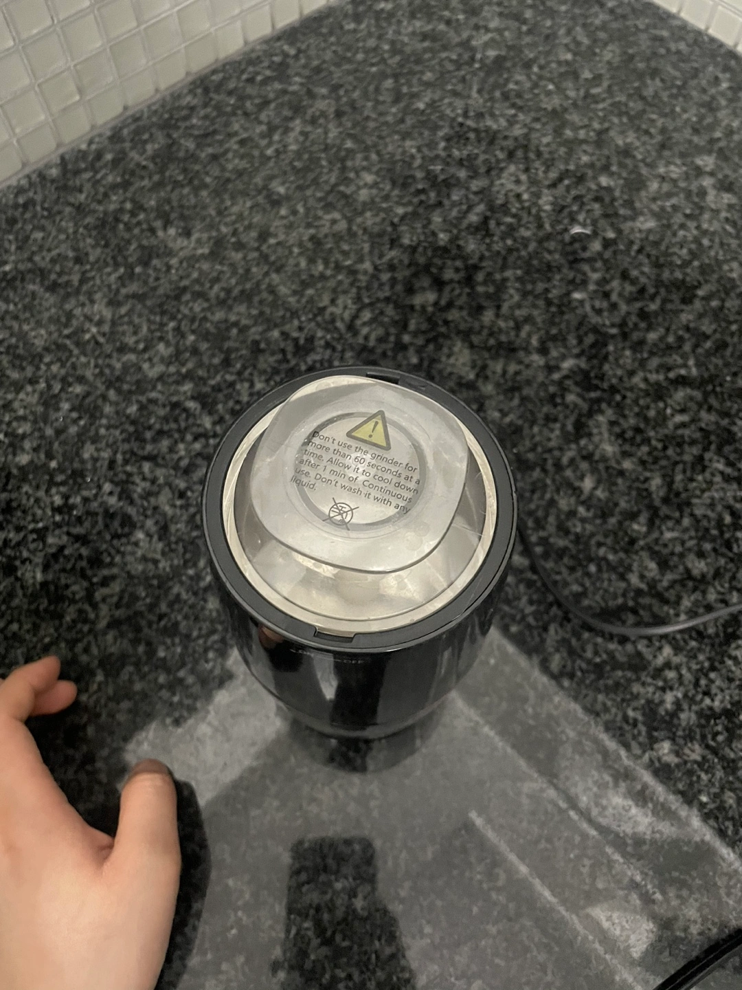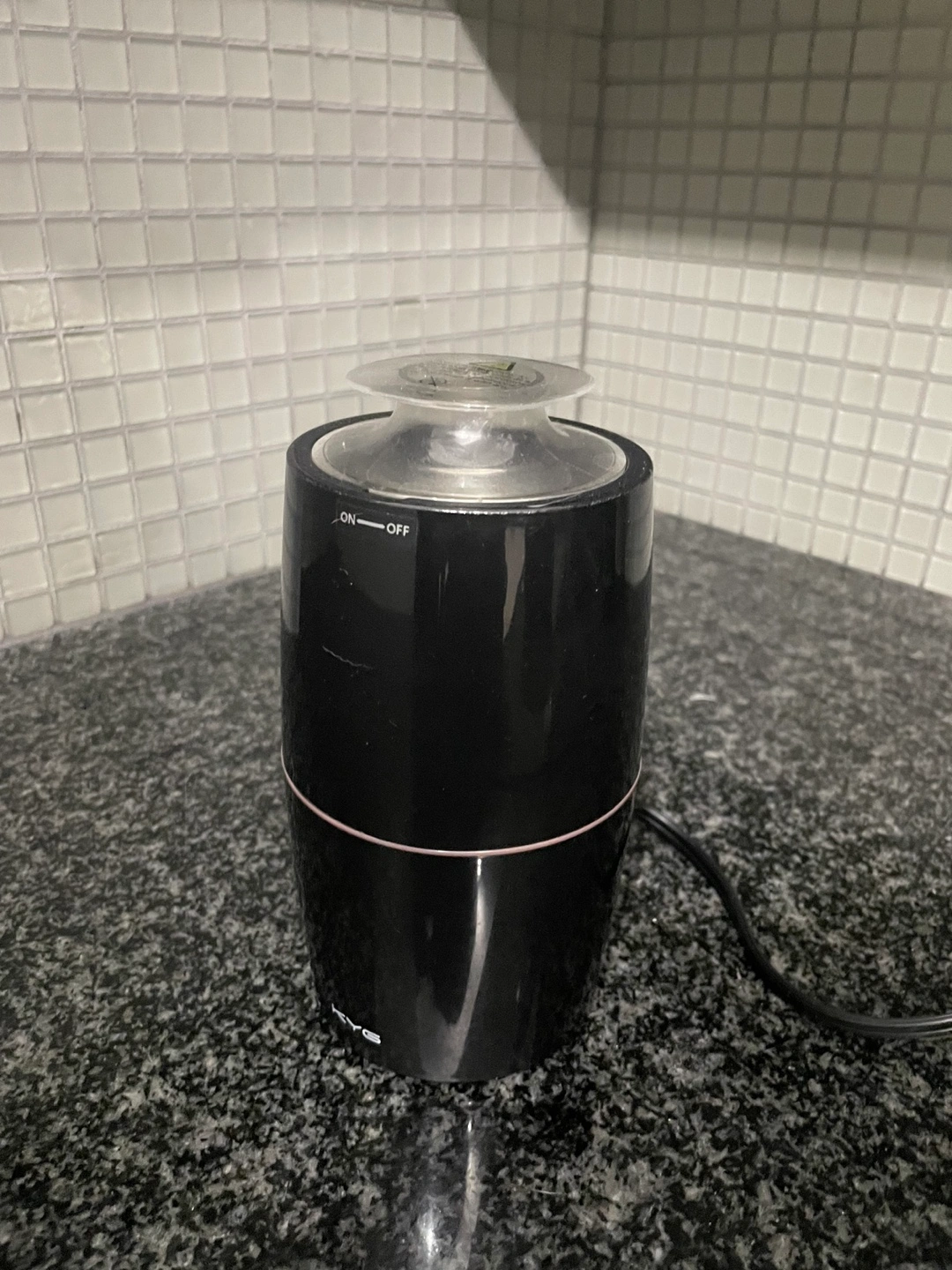 137Small electric herb grinder. Black with silver accents. Simple on/off switch. Compact design. Includes power cord.