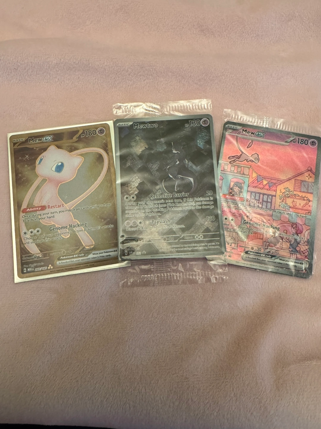 138Three Pokemon trading cards. Mewtwo and two Mew EX cards. All appear to be in good condition, still sealed in packaging. 3 sets available Asking $85 each Or take all 3 sets for $220