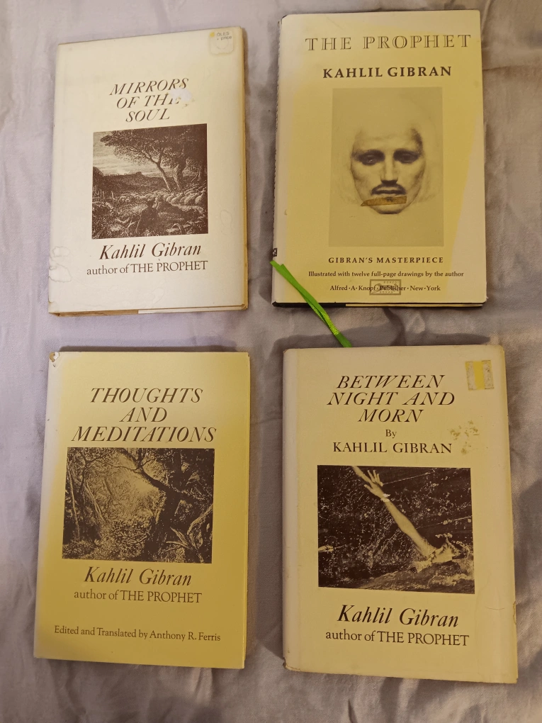 Set of four vintage hard cover Kahlil Gibran books. Titles include *The Prophet*, *Mirrors of the Soul*, *Thoughts and Meditations*, and *Between Night and Morn*.