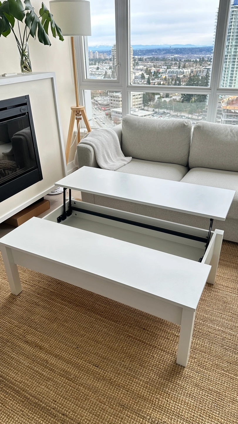 Selling a clean, white lift-top adjustable IKEA coffee table in good condition.