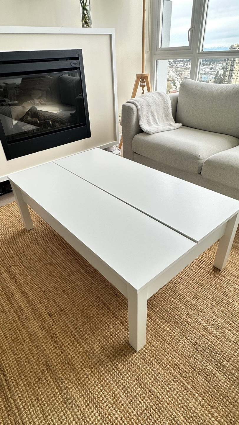 Selling a clean, white lift-top adjustable IKEA coffee table in good condition.