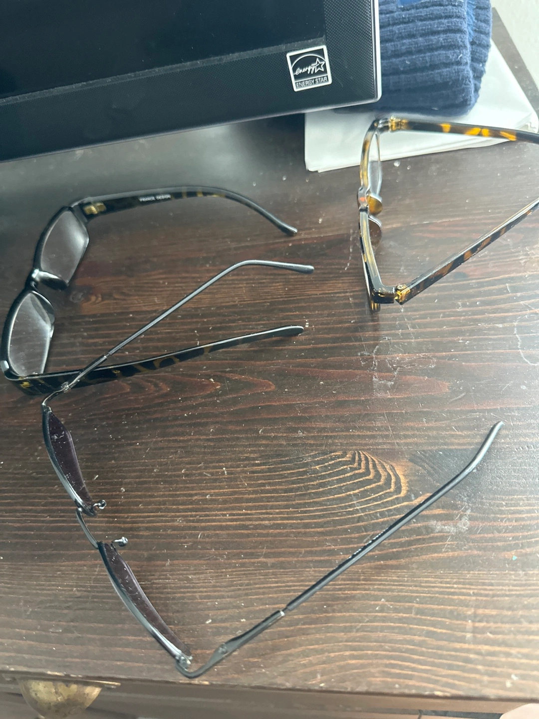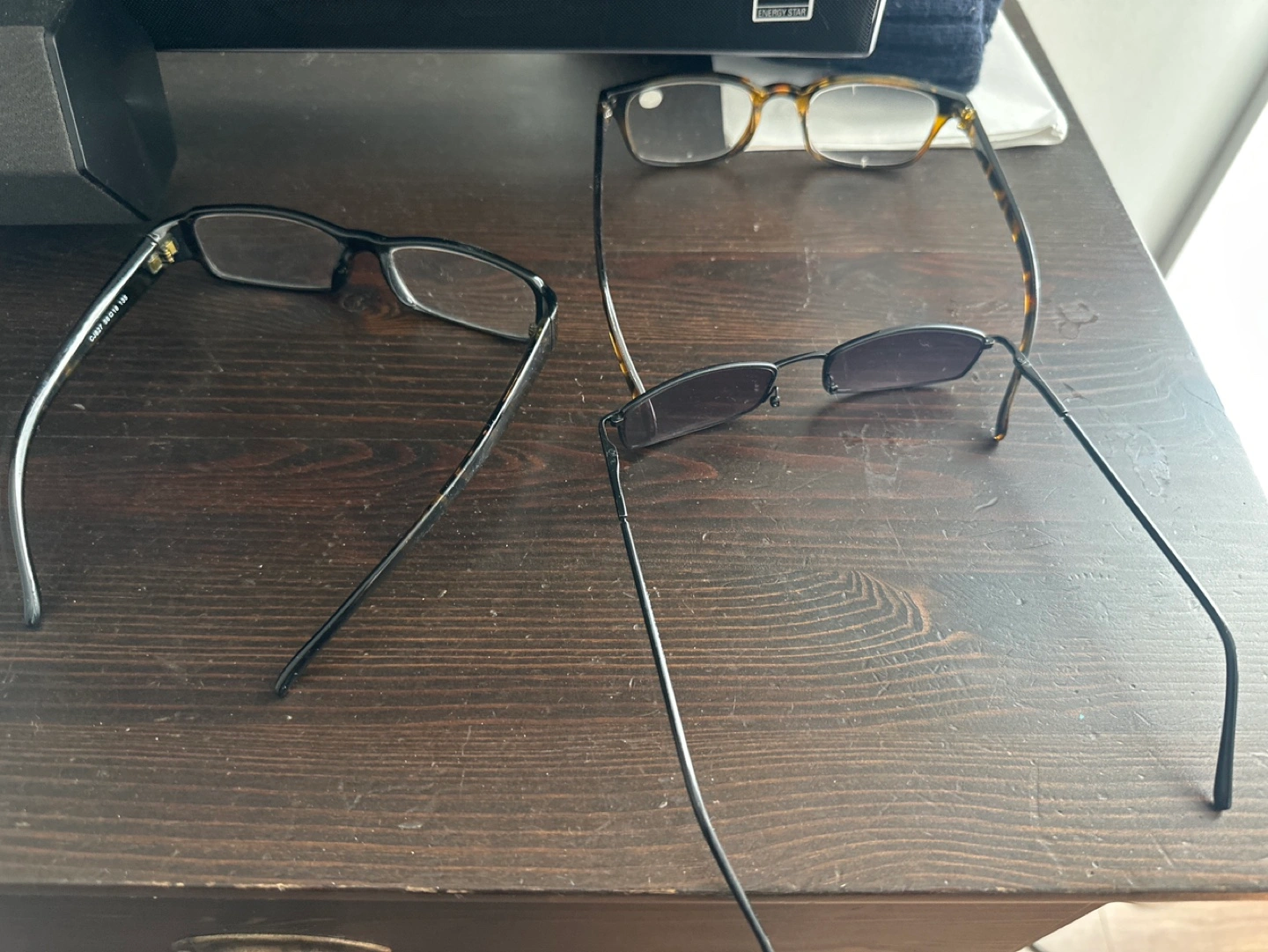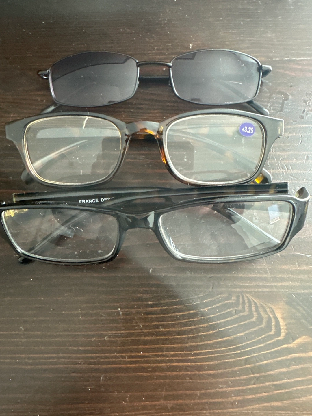 Bundle of three pairs of glasses. Two pairs of reading glasses, one with tortoise shell frames and one black. One pair of sunglasses, black frames. All 3 for $5.