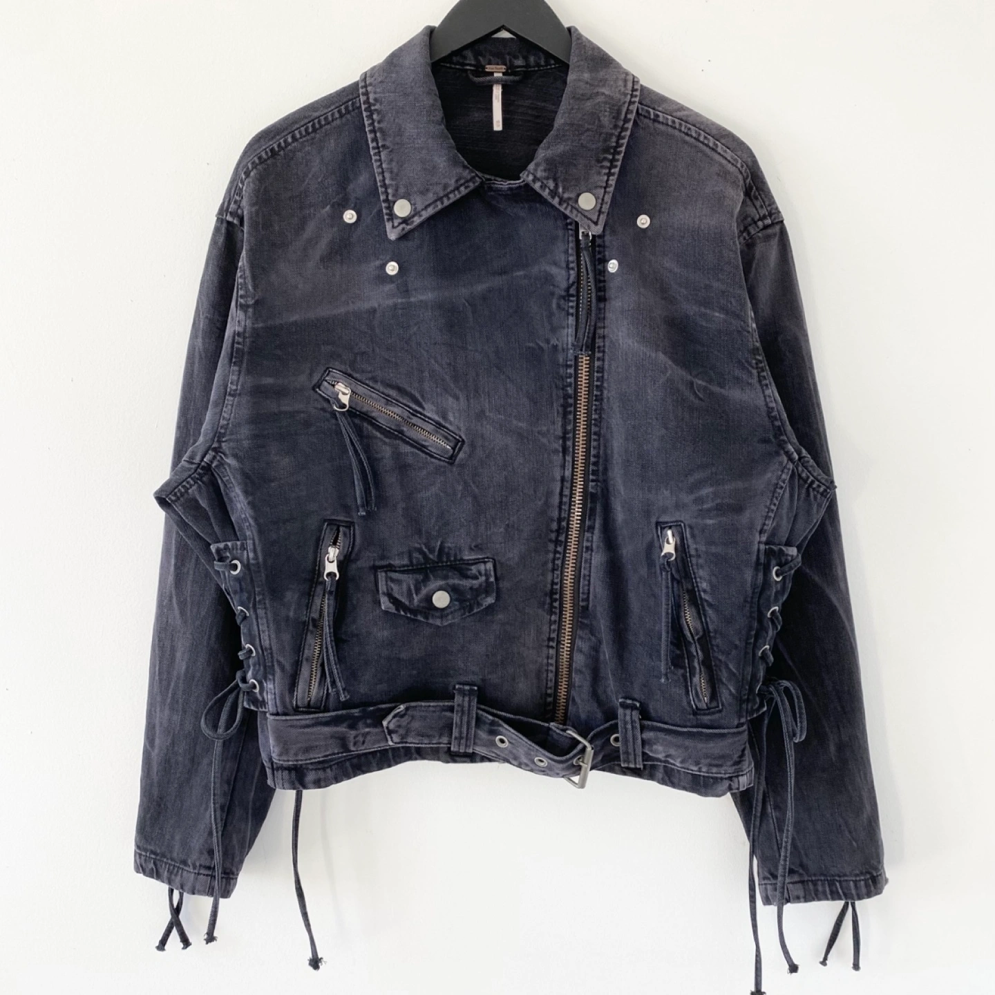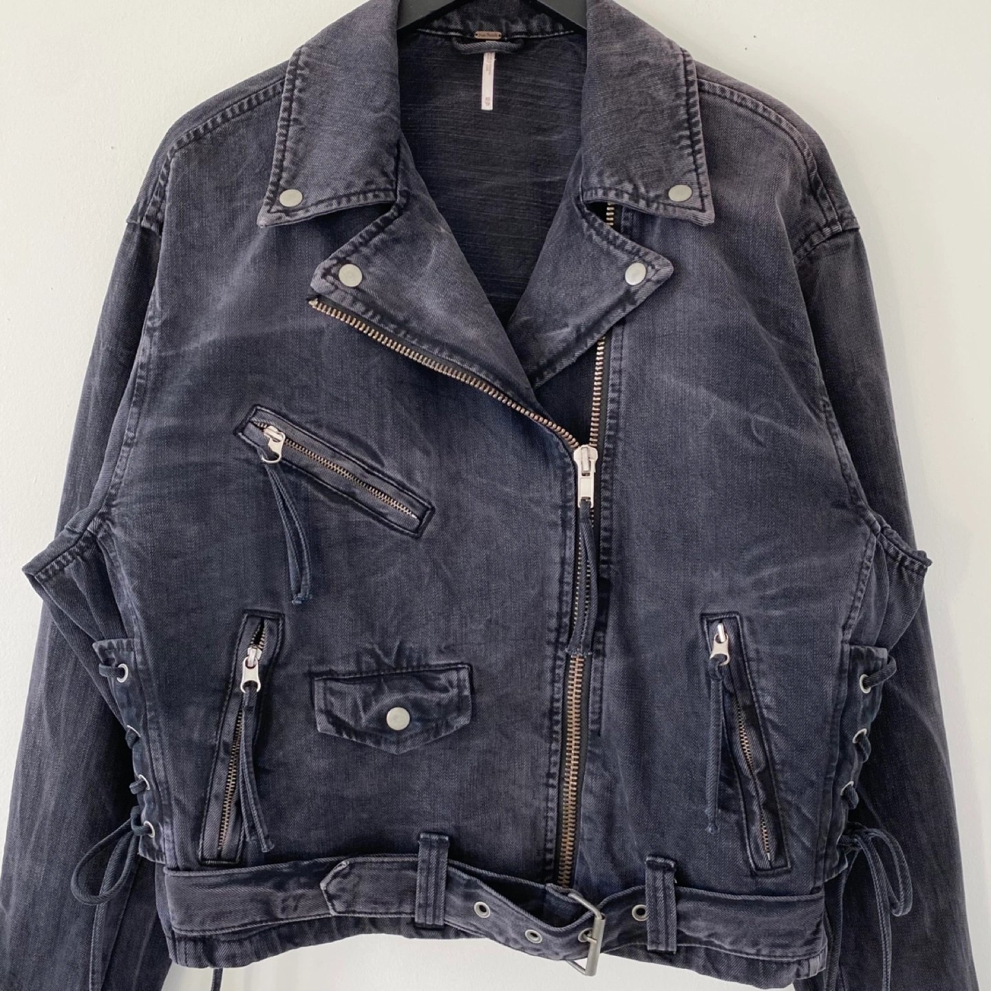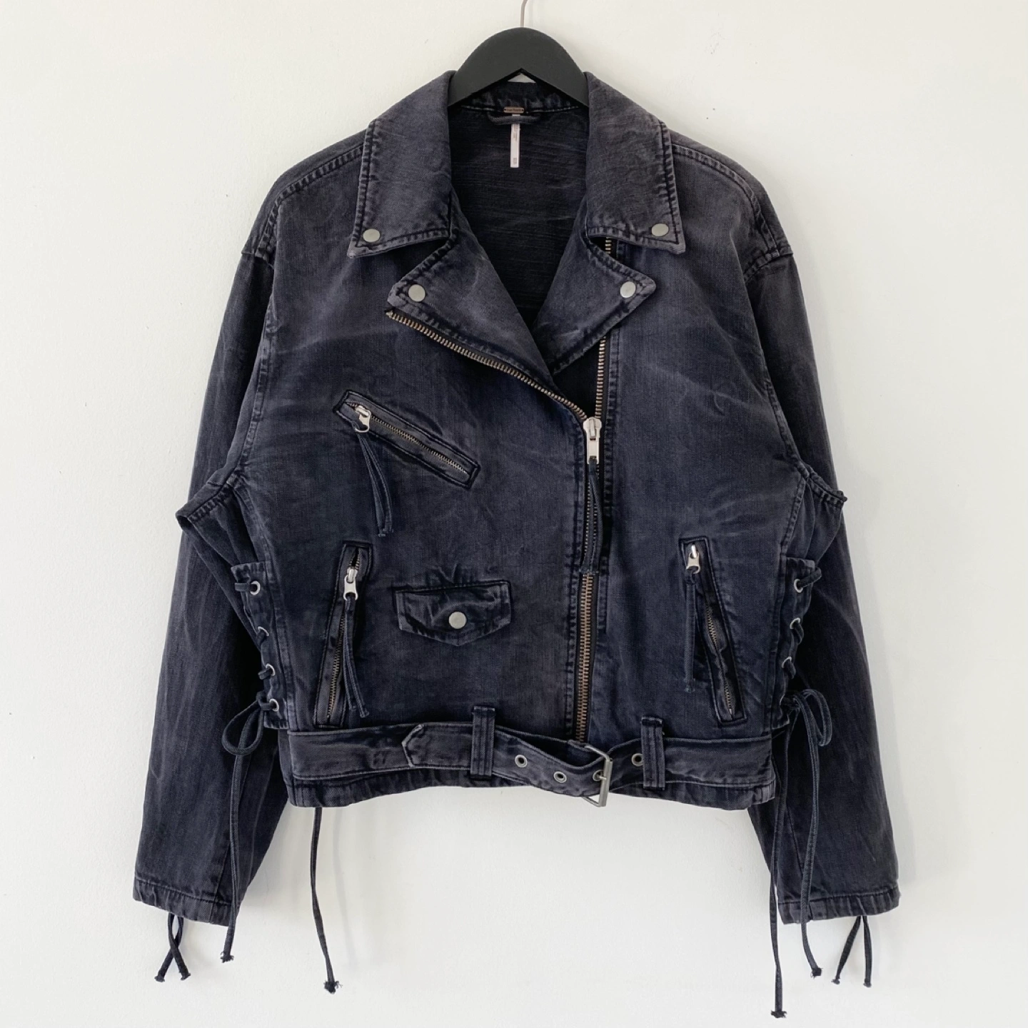 615Pick up only in Leslieville (Queen and Pape) Check out other listings! Free People moto jacket. Size XS but very oversized. Fits like a medium. Made of medium weight 100% cotton. It's very soft and comfortable. There's some general wear but no staining or damage. It's clean and in excellent condition. Size XS (Fits like an M) Approximate measurements laid flat Shoulder 21” Pit to pit 23” Shoulder to cuff 23” Center back length 23”