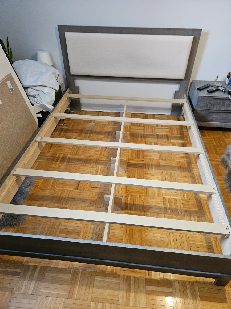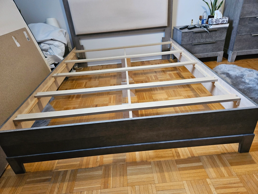 Grey platform bed frame. Queen size. Solid wood construction. Includes neige fabric headboard. Minimal assembly required. pet free smoke free home. No scratches, stains or rips