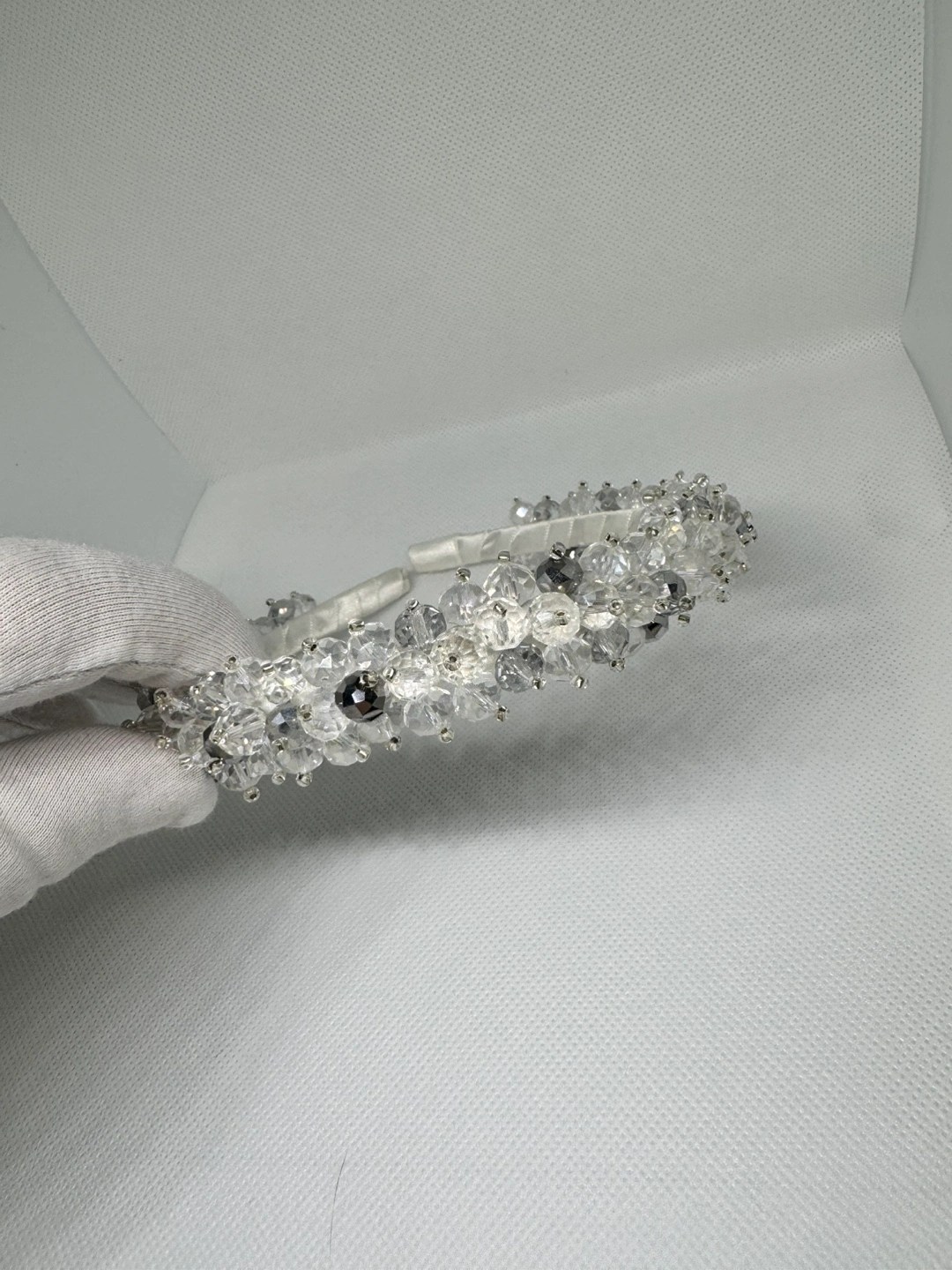 Beautiful beaded headband. Features clear and smoky grey crystals. Silver wire accents. Elegant and sparkly.