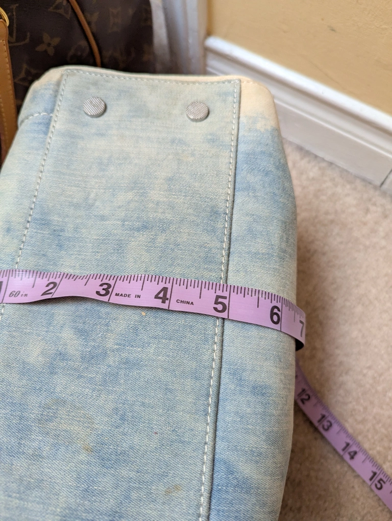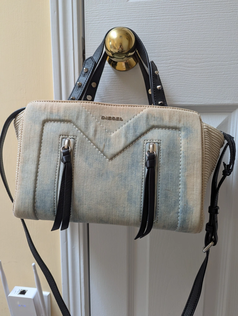 Pre-owned Diesel handbag. Light blue denim exterior, black leather trim. Top handles and shoulder strap. Zipper closure. Some discoloration visible.
