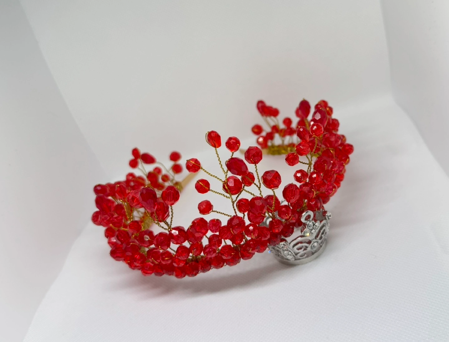 Gorgeous red beaded hair crown. Features many small, red beads on gold wire. Includes a small, silver crown accent.