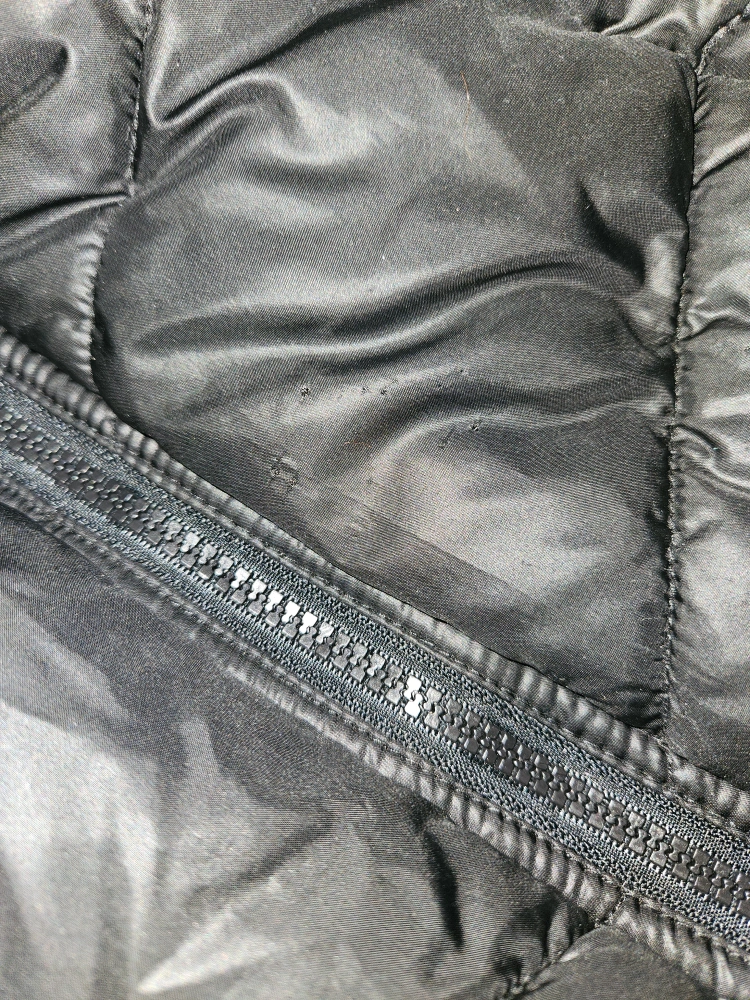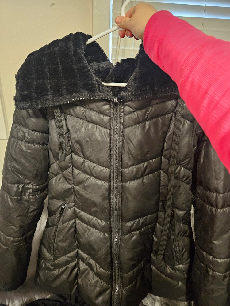 Black quilted puffer jacket. Features a faux fur lined hood and zipper closure. Side pockets. Great for colder weather.