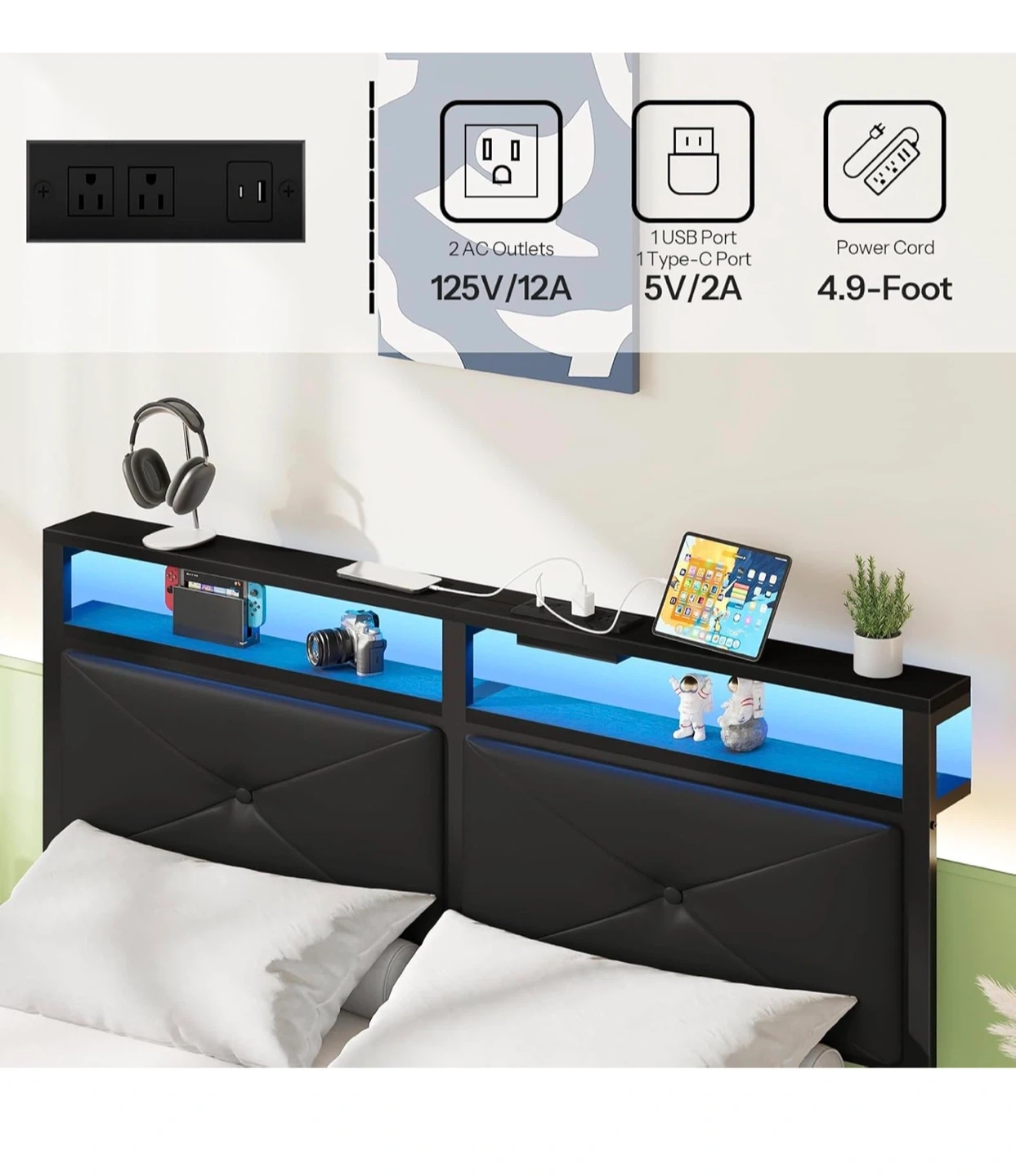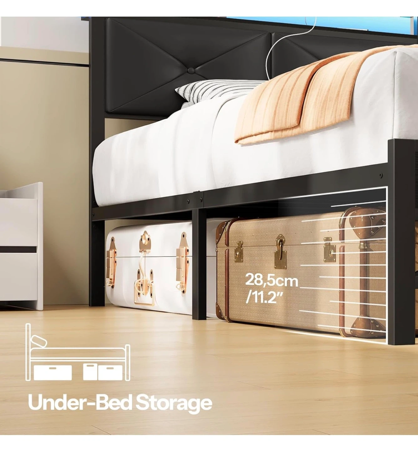 This queen size bed frame features a stylish headboard with built-in LED lights and convenient charging options. It includes 2 AC outlets, 1 USB Type-C port, and a 4.9-foot power cord. The frame offers under-bed storage with a clearance of 11.2 inches. Its dimensions are 153cm x 217cm x 112cm.