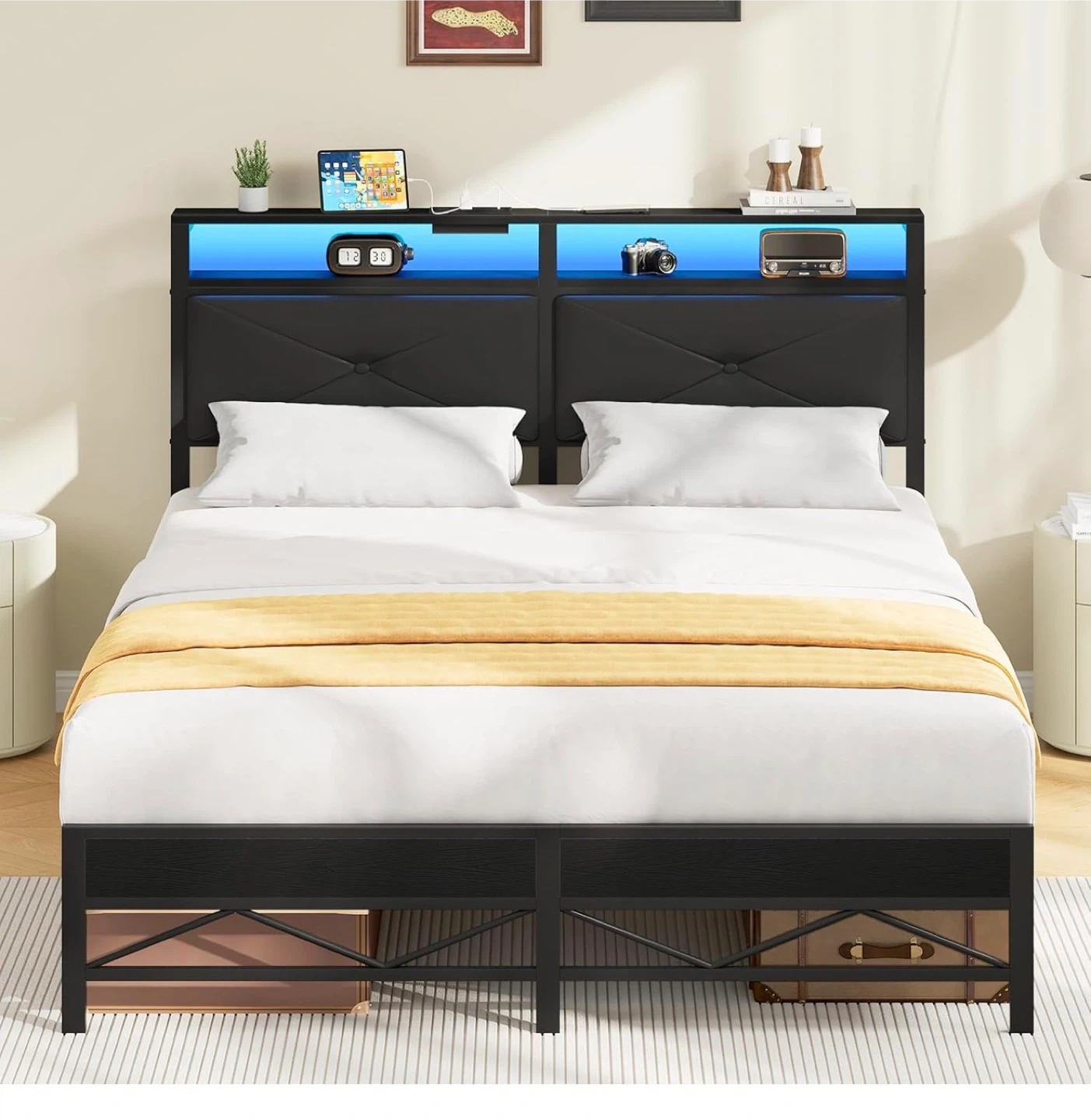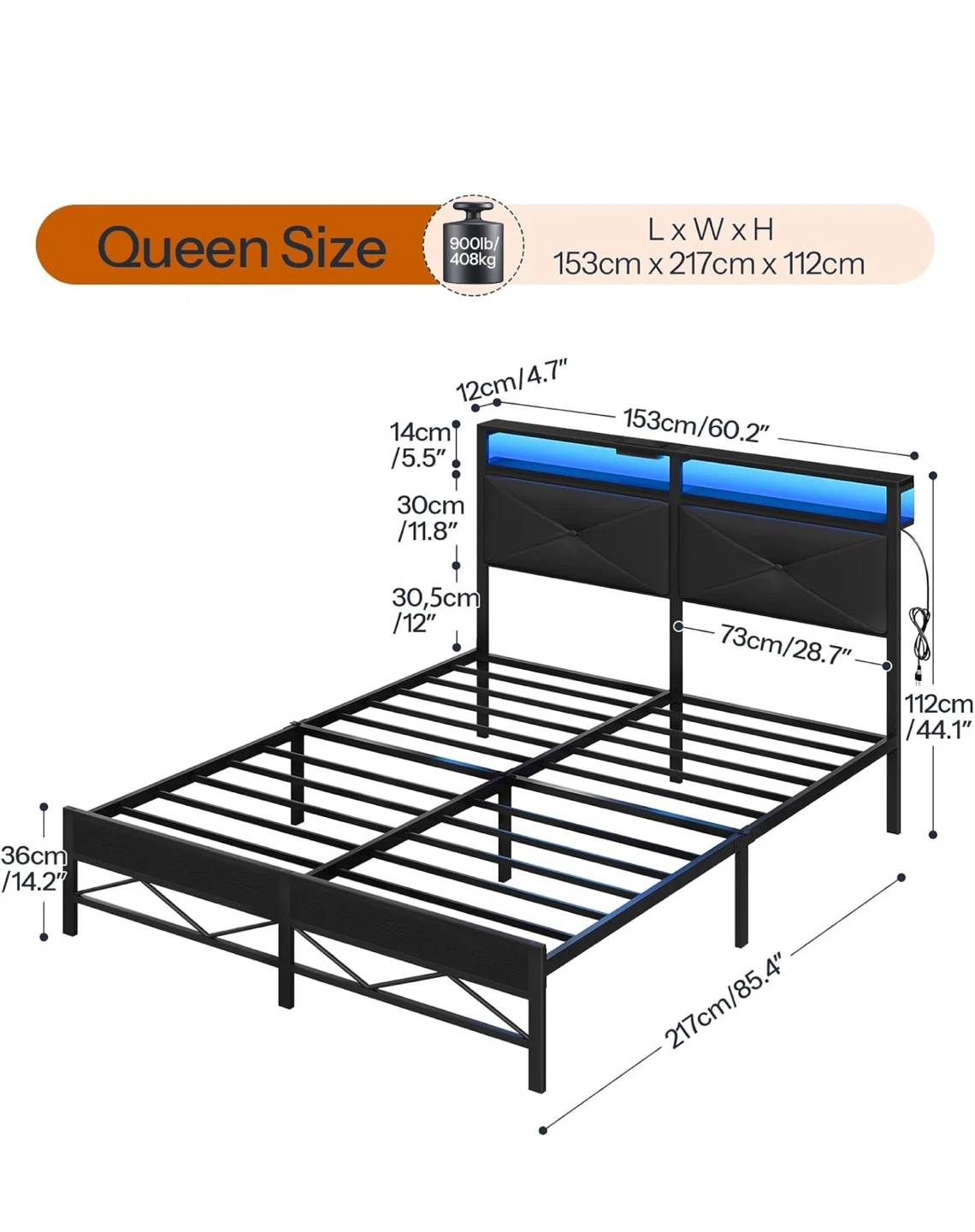 This queen size bed frame features a stylish headboard with built-in LED lights and convenient charging options. It includes 2 AC outlets, 1 USB Type-C port, and a 4.9-foot power cord. The frame offers under-bed storage with a clearance of 11.2 inches. Its dimensions are 153cm x 217cm x 112cm.
