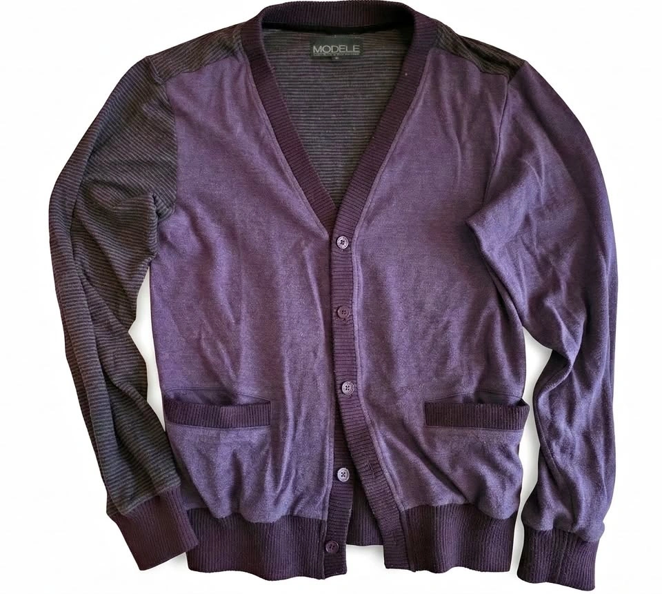 Step up your layering game with this unique color-block cardigan. It features a rich, solid purple body contrasted by dark grey/black finely striped sleeves and shoulder panels. The sweater has a deep V-neckline with a secure 5-button front closure and two handy front slip pockets. It's finished with a ribbed hem, cuffs, and placket for a sharp silhouette. Perfect for layering over a collared shirt for a 'Dark Academia' vibe or over a band tee for everyday style. Pre-owned, great condition with normal signs of gentle wear.