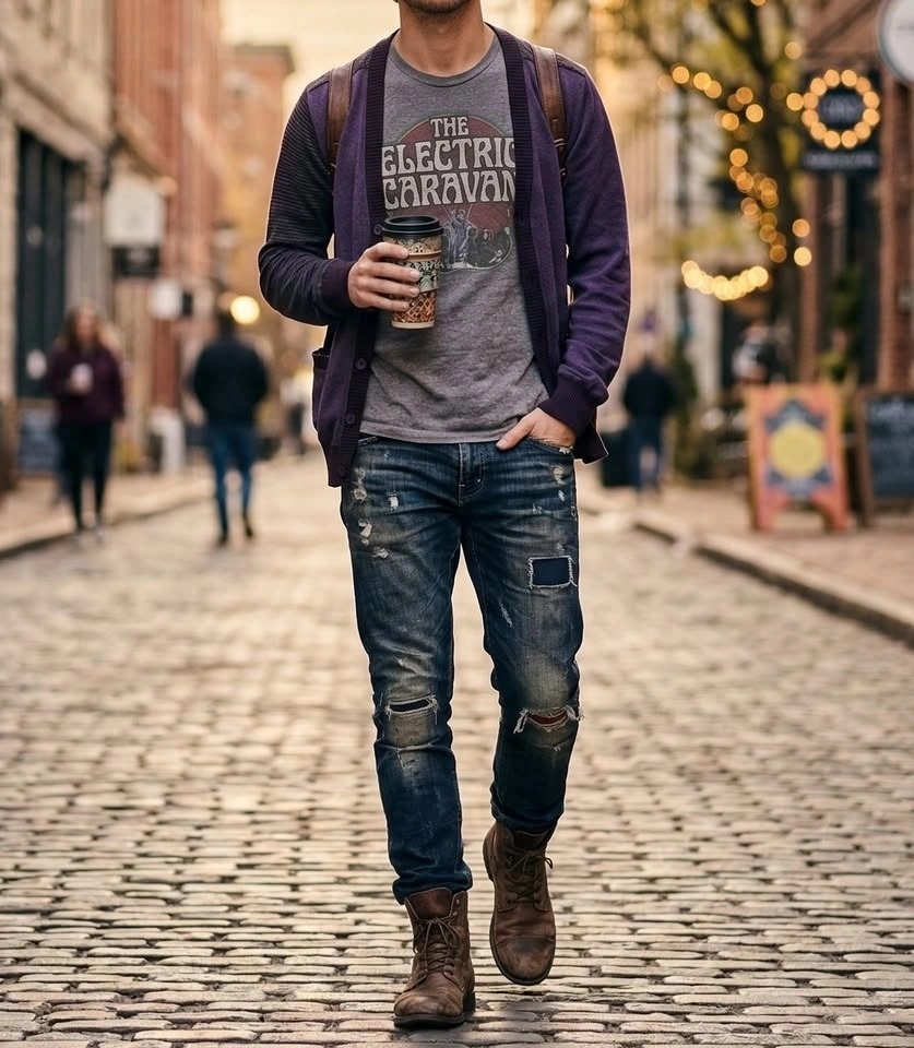 Men's Color-Block Cardigan - Deep Purple & Striped Sleeves