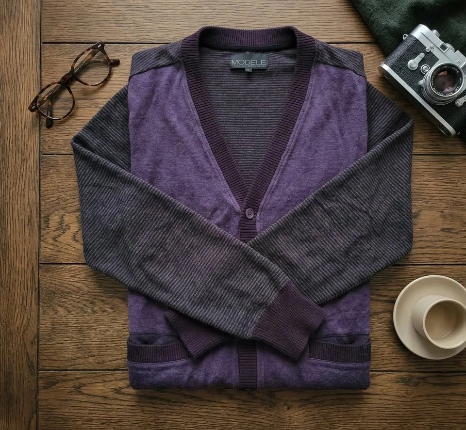 Step up your layering game with this unique color-block cardigan. It features a rich, solid purple body contrasted by dark grey/black finely striped sleeves and shoulder panels. The sweater has a deep V-neckline with a secure 5-button front closure and two handy front slip pockets. It's finished with a ribbed hem, cuffs, and placket for a sharp silhouette. Perfect for layering over a collared shirt for a 'Dark Academia' vibe or over a band tee for everyday style. Pre-owned, great condition with normal signs of gentle wear.
