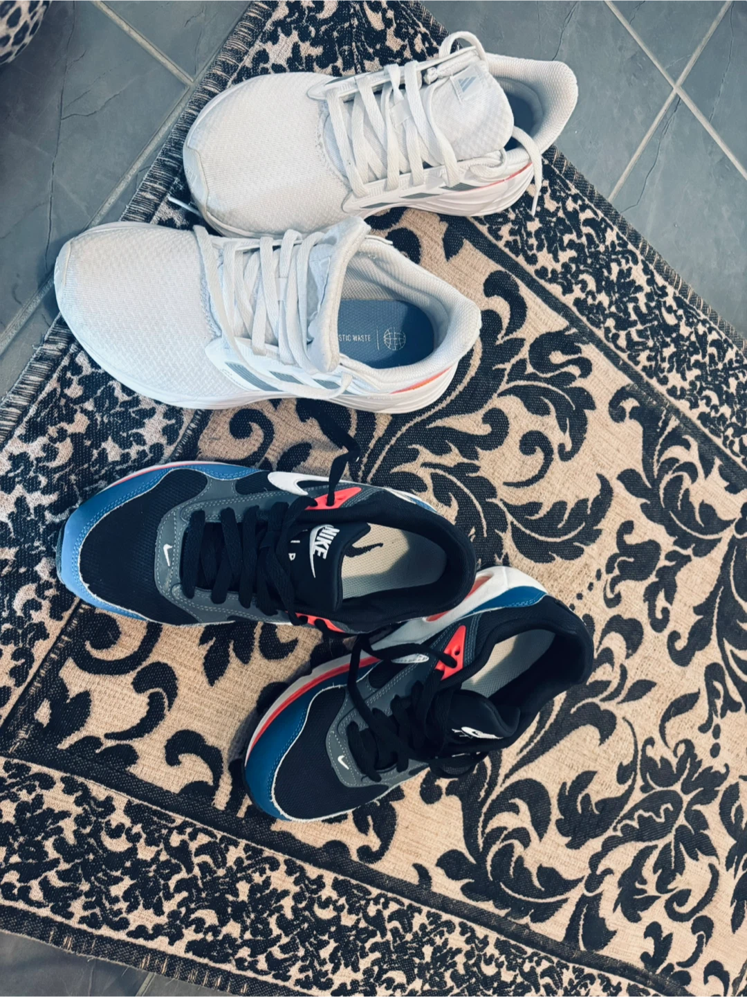 Selling a pair of Nike Air Max and Adidas running shoes. The Nike shoes are black, blue, red and white. The Adidas shoes are white. Both are size US 5.5