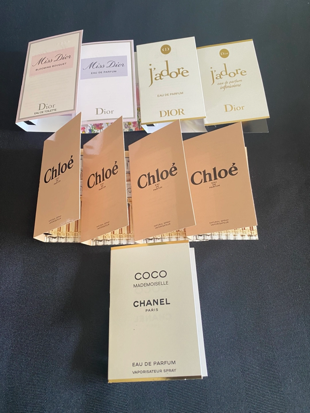Collection of perfume samples. Includes Miss Dior, J'adore, and Coco Mademoiselle. Eau de parfum. Great for trying before committing to a full bottle. $5 each.