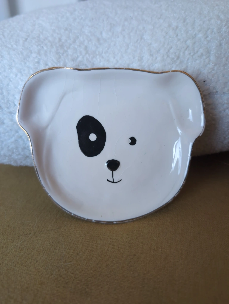Small ceramic trinket dish. Features a cute dog design with black markings and gold trim. Perfect for jewellery or small items.