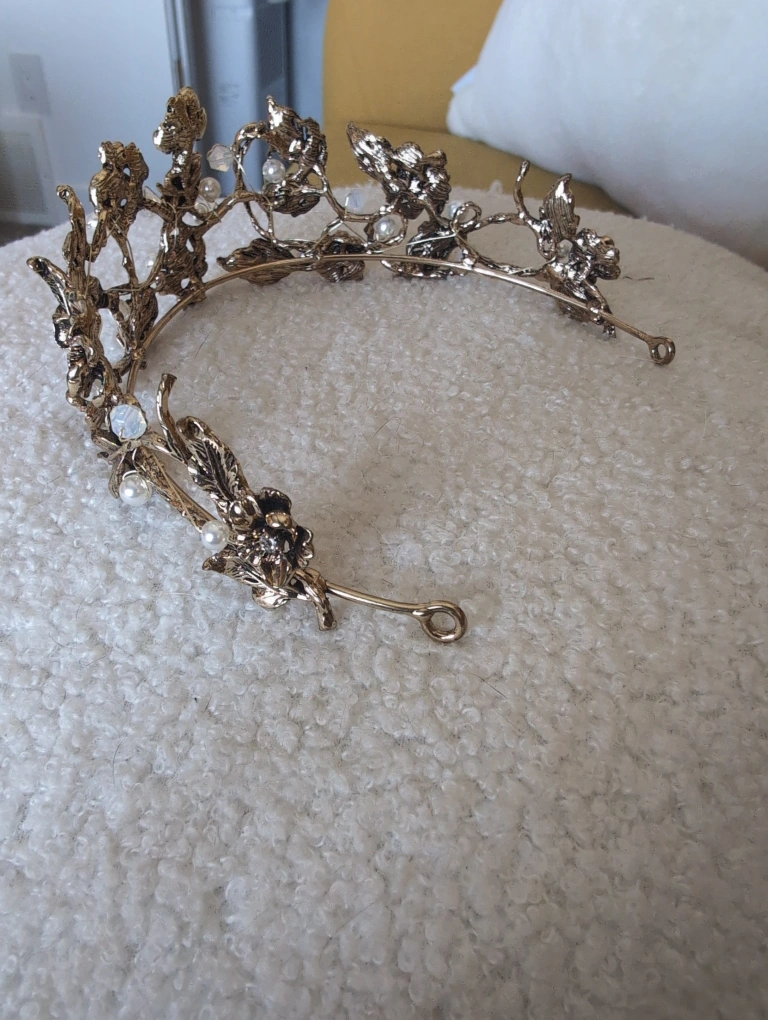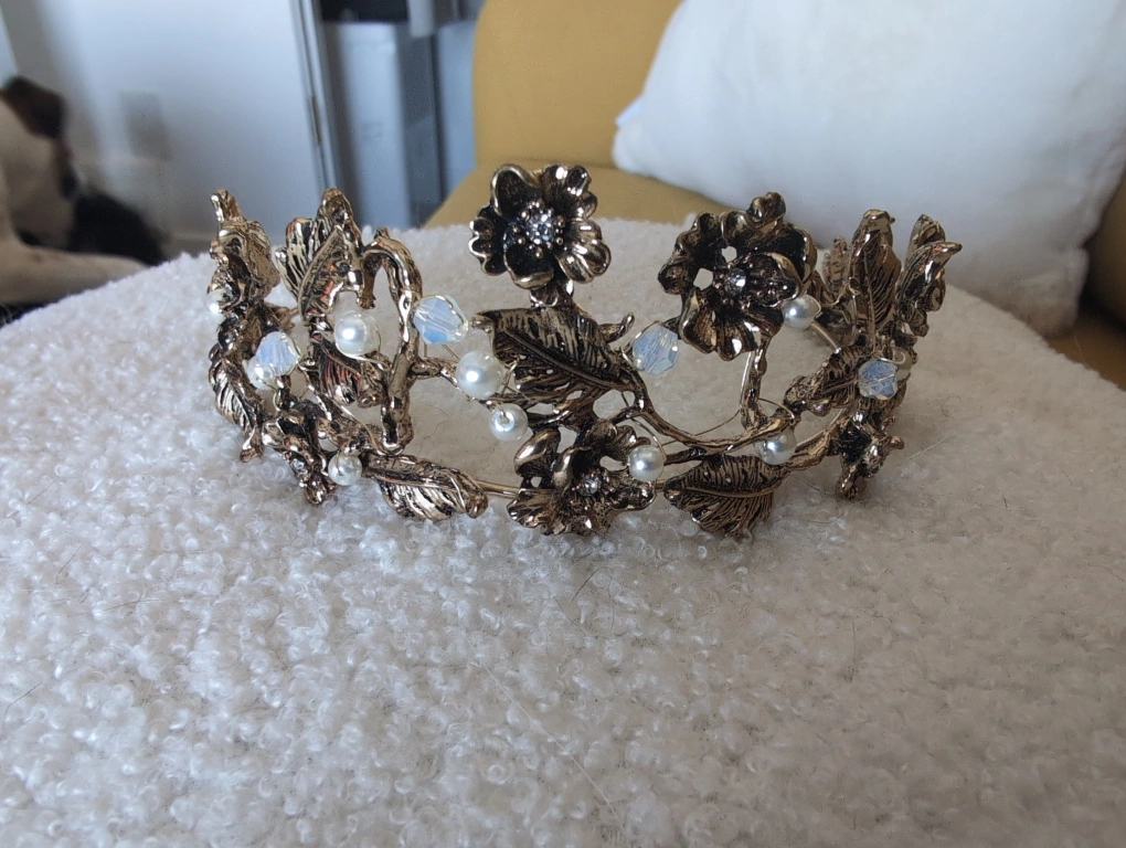 Beautiful gold-tone tiara. Features delicate floral design with pearls and opal accents. Perfect for weddings or special occasions. Elegant and eye-catching. From the fairy store in Amsterdam.